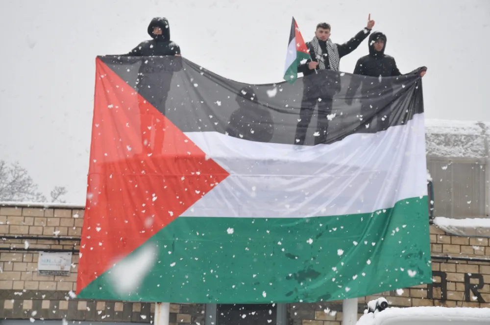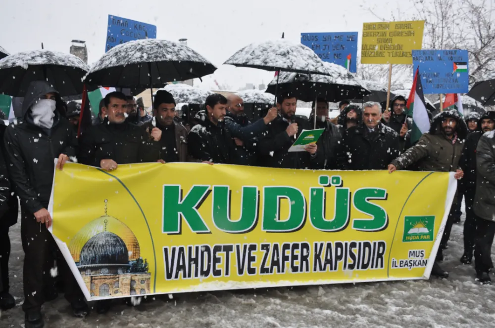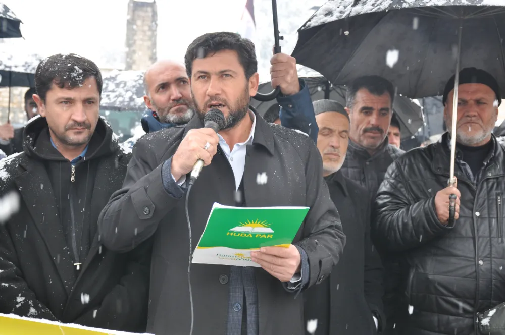 Cuma namazı sonrası Belediye Meydanı’nda toplanan partililer sloganlar atarak İsrail’e tepki gösterdi. Yoğun kar yağışının altında açıklama yapan HÜDA PAR İl Başkanı Mehmet Şirin Çağlayan, 77 gündür Gazze’de bir soykırım yaşandığını söyledi. İsrail’in bir terör örgütü olduğunu ifade eden Mehmet Şirin Çağlayan, “Siyonist terör örgütü İsrail, bir bütün olarak batı dünyasını da arkasına alarak Amerika'sıyla, İngiltere'siyle, Fransa'sıyla, Almanya'sıyla saldırıya geçti. Öyle barbarca bir saldırı ki, 77 gündür gökten ateş yağıyor. 77 gündür çocuklar, kadınlar ve masum insanlar katlediliyor” dedi.