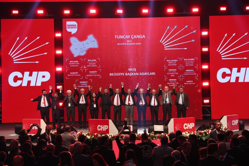 CHP Muş Belediye Başkan Adayı Tuncay Çanga olurken, Bulanık Belediye Başkan Adayı Şemsettin Onuler, Malazgirt Belediye Başkan Adayı Mevlüt Güvenir, Hasköy Belediye Başkan Adayı Rahmi Paçal, Korkut Belediye Başkan Adayı Taner Tanrıvermiş, Varto Belediye Başkan Adayı Akın Okyay, merkeze bağlı Kızılağaç Belediye Başkan Adayı Kiyasettin Eke, merkeze bağlı Konukbekler Belediye Başkan Adayı Hakim Güler, merkeze bağlı Yeşilova Belediye Başkan Adayı Nizamettin Karasu, Bulanık’a bağlı Rüstemgedik Belediye Başkan Adayı Aykan Aktuğral, Malazgirt’e bağlı Konakkuran Belediye Başkan Adayı Alattin Öztürk, Hasköy’ün Düzkışla Belediye Başkan Adayı Serhat Aktaş oldu.