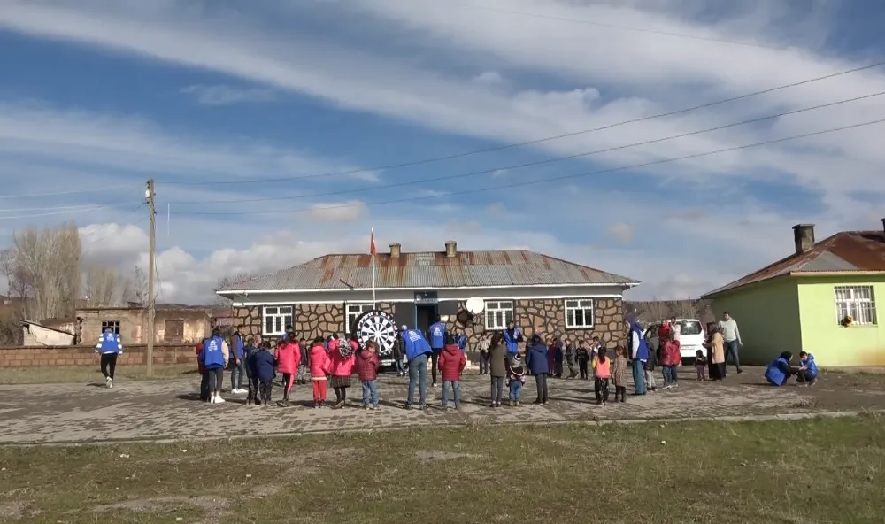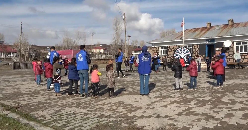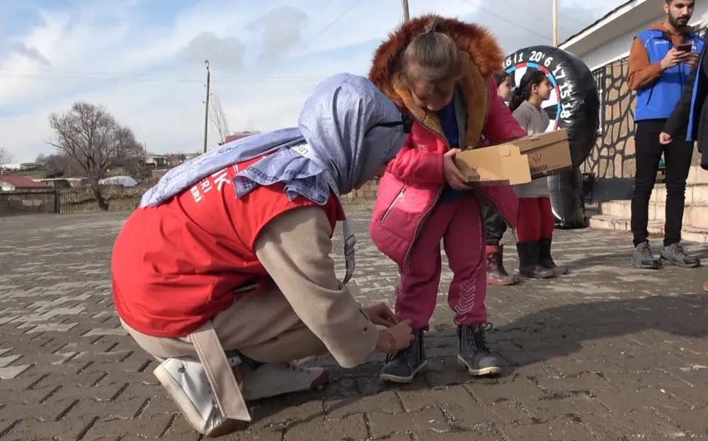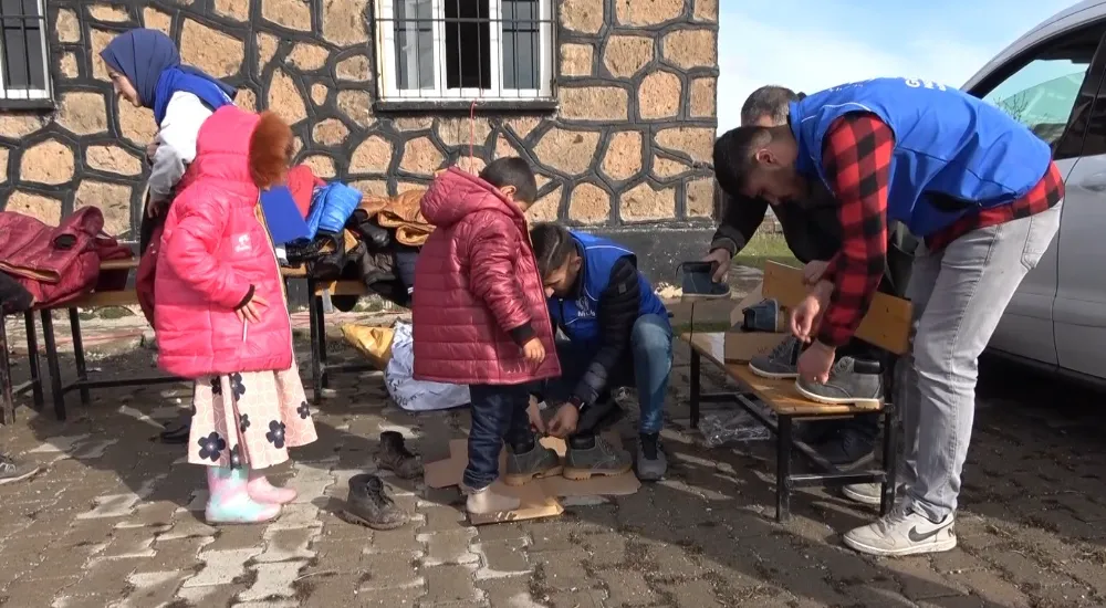 Kış mevsimini sıcak geçirmeleri için hayırsever vatandaşlardan gelen mont ve bot yardımlarını köy köy dolaşarak dağıtan gençler, çocuklarla oyunlar oynayarak güzel vakit geçirmelerini sağladı.