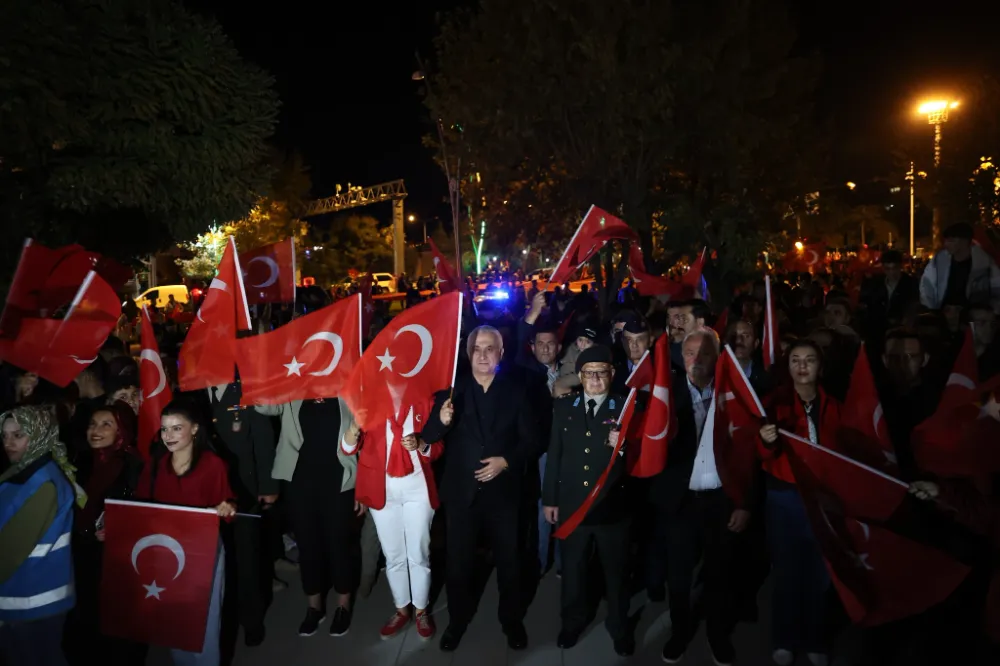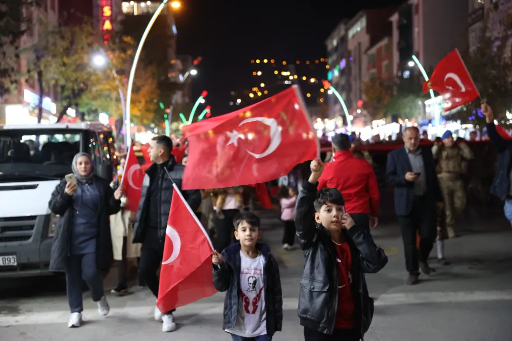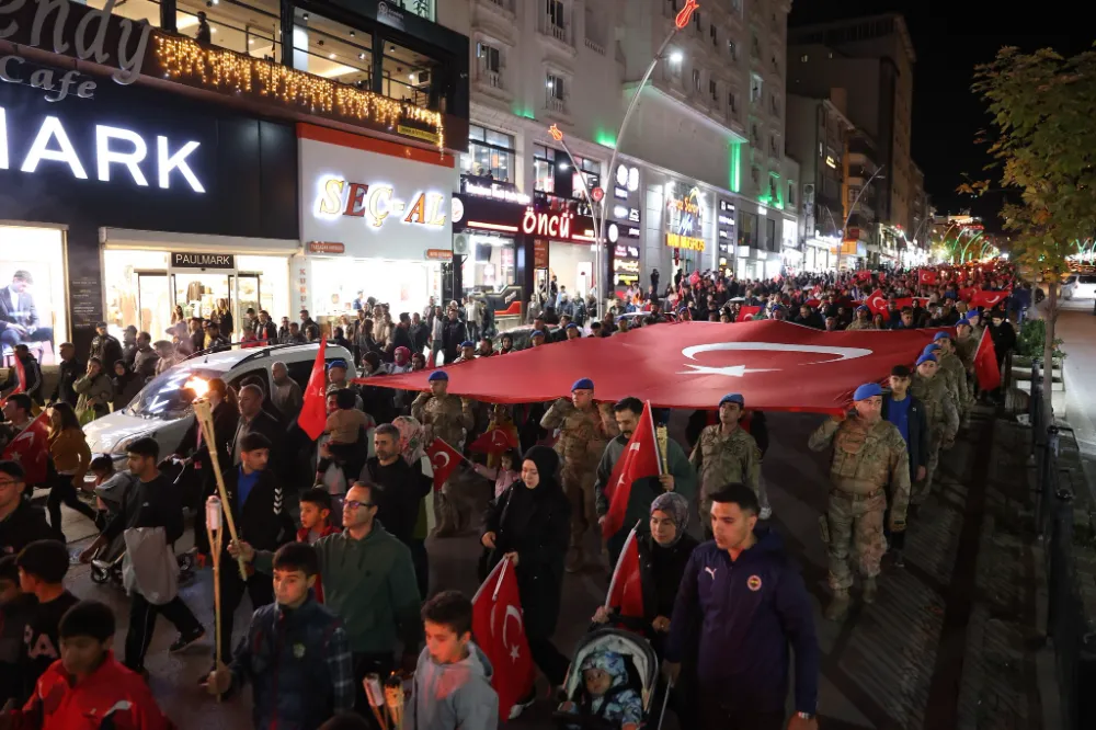 Muş’ta vatandaşlar, ellerinde meşaleler ve Türk bayraklarıyla düzenlenen fener alayı yürüyüşünde Cumhuriyet’in 102’nci yılını coşkuyla kutladı.