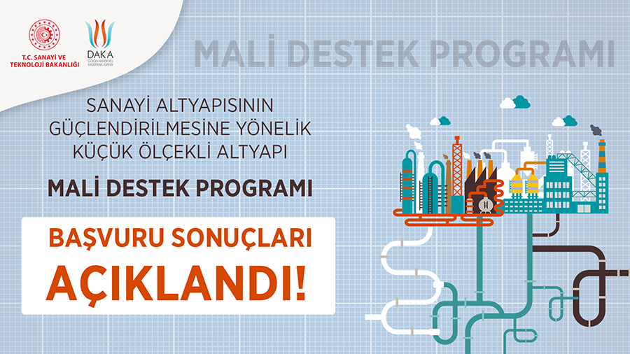 Doğu Anadolu Kalkınma Ajansı tarafından imalat sanayi sektörünün faaliyet gösterdiği ortak alanların teknolojik, teknik ve fiziki altyapılarının geliştirilmesi ve yeni yatırımlar yapılmasını sağlamak amacıyla ilan edilen “Sanayi Altyapısının Güçlendirilmesine Yönelik Küçük Ölçekli Altyapı Mali Destek Programı” başvuru sonuçları açıklandı.