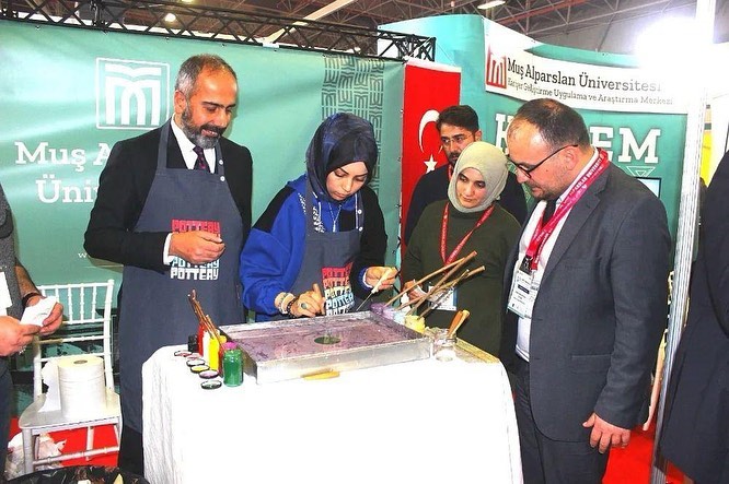 Fuarda stantları gezen MAUN Rektörü Prof. Dr. Mustafa Alican, Van Yüzüncü Yıl Üniversitesi Rektörü Prof. Dr. Hamdullah Şevli ve eşi, el sanatları bölümü stantlarını ziyaret ederek Tasarım Bölümü Öğretim Görevlisi Serdar Dik ve El Sanatları Bölümü Öğretim Görevlisi Emre Koç’la görevli öğrencilerden ebru sanatı ve seramik uygulamaları ile ilgili bilgiler aldı.