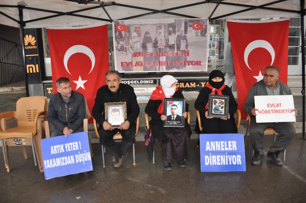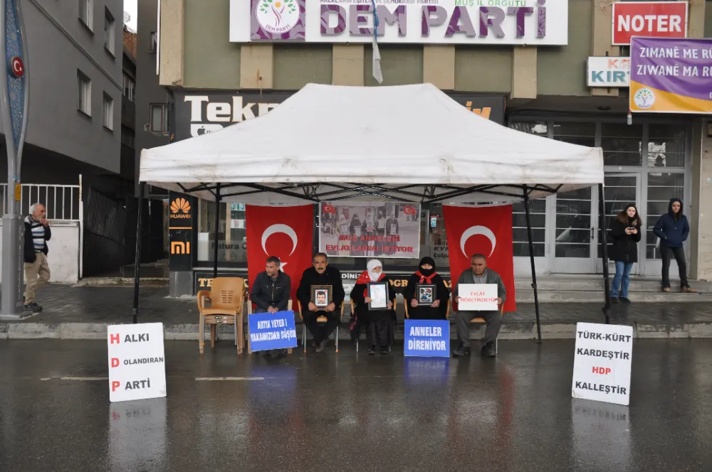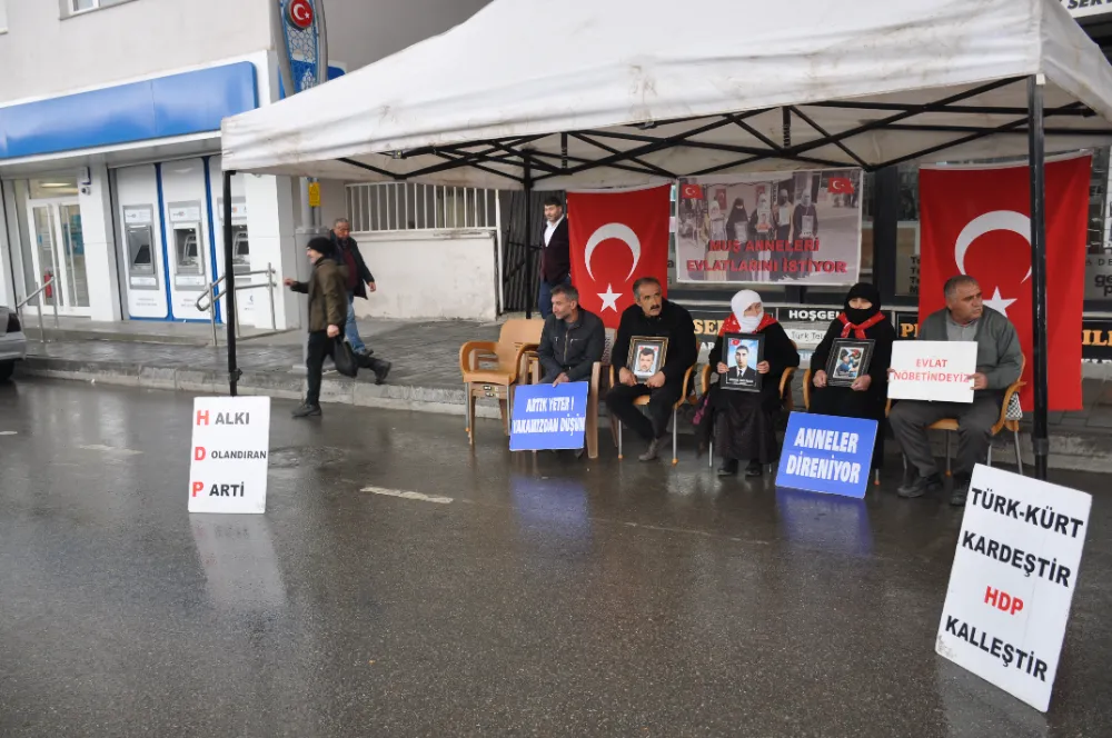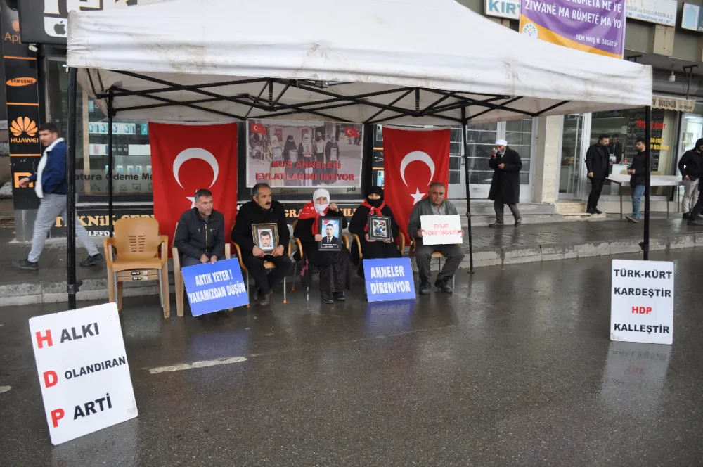 Çocuklarının terör örgütü PKK mensupları tarafından dağa kaçırıldığı iddiasıyla DEM Parti Muş İl Başkanlığı önünde oturma eylemi başlatan aileler, 138 haftadır kararlı bir şekilde devam ettirdikleri evlat nöbetini sürdürüyor.