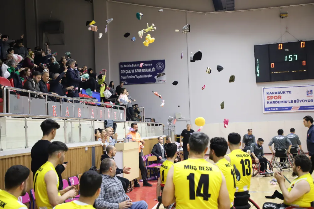 Karabük Demirkartal Gençlik ve Spor Kulübü ile Muş Bedensel Engelli Spor Kulübü arasında oynanan karşılaşmada taraftarlar depremzede çocuklar için parkeye oyuncak, atkı, bere ve eldiven attı.