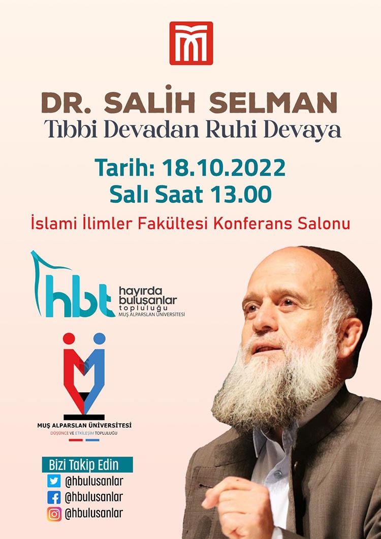 Op. Dr. Salih Selman, “Tıbbi Devadan Ruhi Devaya” başlığı ile 18 Ekim 2022 tarihinde Muş merkezdeki İslami İlimler Fakültesinde (İİF) konferans verecek.