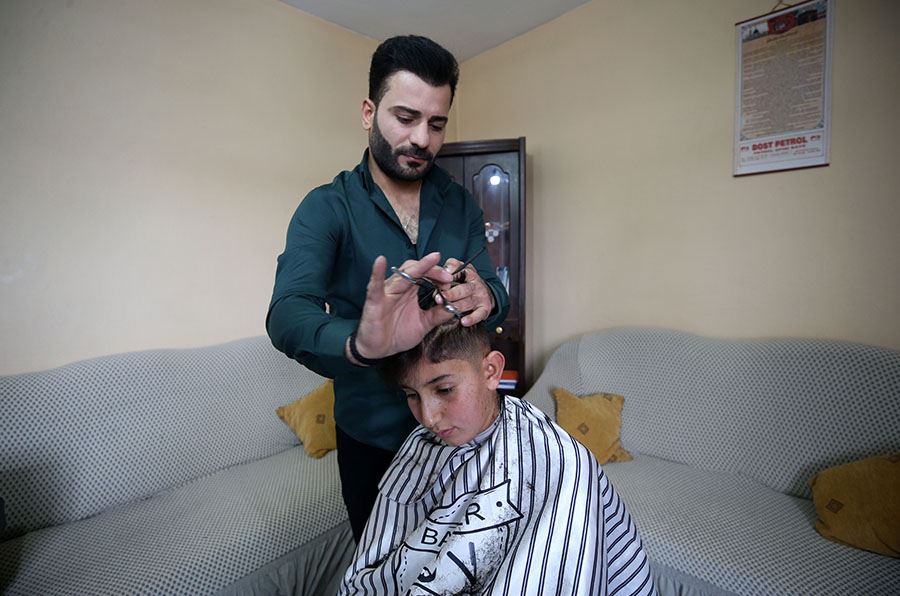 İlçe merkezinde kuaför salonu işleten Akdeniz, boş zamanlarında muhtarların öncülüğünde köylere giderek çocukları evlerinde tıraş ediyor.
