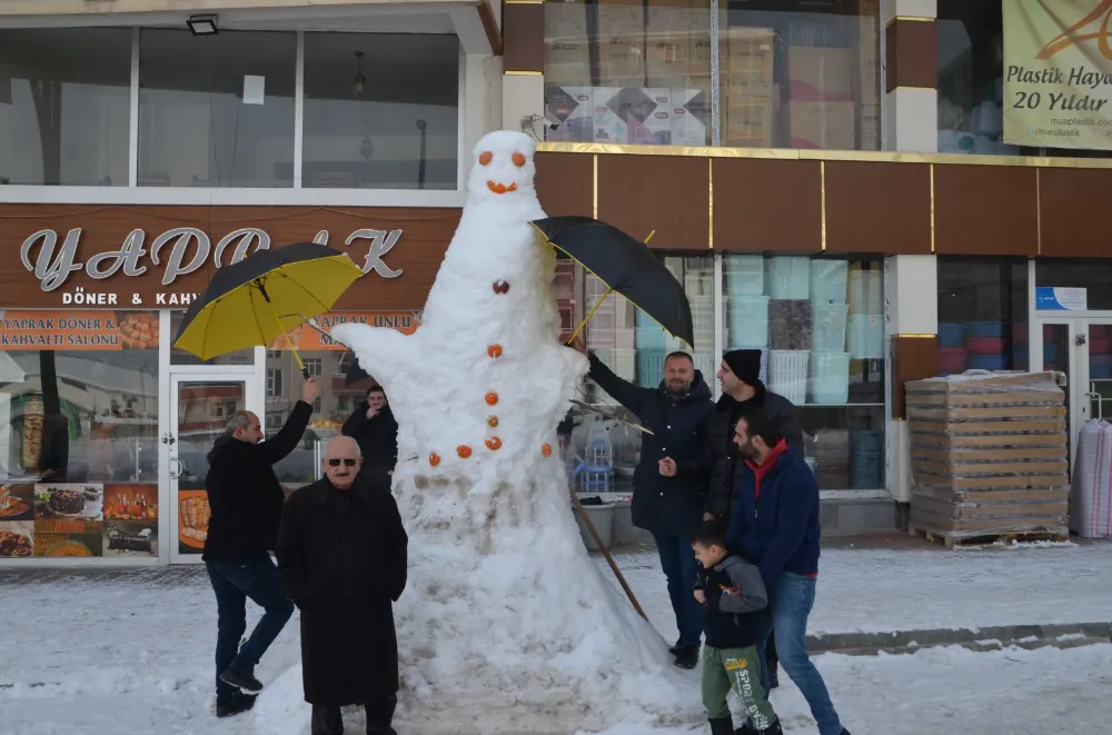 Muş'ta esnafın, işyerlerinin önünde yaptığı 3 metrelik kardan adam ilgi gördü.