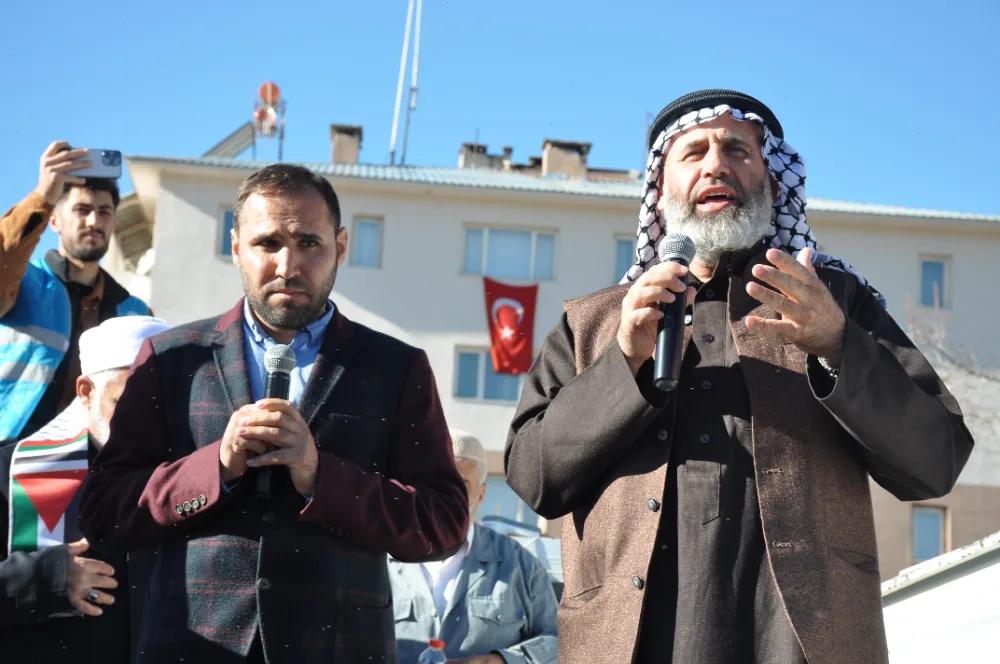 Muş Alparslan Üniversitesi'nde görevli Dr. Öğretim Üyesi Abdulkadir Şen, halka Arapça hitap eden Filistinli Alimler Birliği Başkanı Nevaf Tekruri'nin konuşmasını Türkçe tercüme etti. Tekruri, bugün Mescidi Aksa tufanını yaşadıklarını kaydetti. Muşlulara seslenen Tekruri, "Kudüs'te şahitlik ediyor ki sizler Selahattin Eyyubi'nin yanındasınız. Sadece Allah için gücümüzü bir araya getirip birlik olmalıyız. Mescidi Aksa ümmetin cihadıdır. Tufanı Aksa ümmetin davasıdır, sadece Filistin'in değil sizin de davanızdır. İşte bu Mescidi Aksa tufanını başlatan yiğitlerimiz, Peygamber efendimizin izinde yürüyorlar. Ashabın yolunda ilerlemek için bu savaşı başlattılar. Bu savaşı mücahitler başlatmadı, ülkemizi işgal edenler başlattı. Osmanlı Devleti Filistin'den çekildikten sonra bu savaş 1940'lı yıllarda başladı, şimdi başlamadı. Savaşı başlatanlar her gün Mescidi Aksa'ya hakaret edenlerdir. Her gün bu aşağılık Siyoniztler pis ayakkabılarıyla mescidimize gidiyorlar, mescidimize hakaret ediyorlar” dedi.