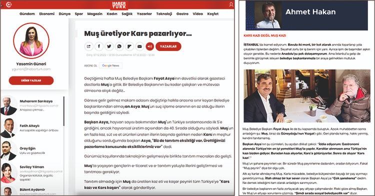 Haber Türk yazarı Yasemin Güneri ‘Muş üretiyor Kars pazarlıyor’ başlığı ile kaleme aldığı yazısında Muş ve Başkan Asya’dan övgüyle bahsederken Hürriyet Gazetesi Genel Yayın Yönetmeni Ahmet Hakan ise ‘Kars kazı değil Muş kazı’ başlıklı yazısında Muş’un tanıtım eksikliğine dikkat çekti.