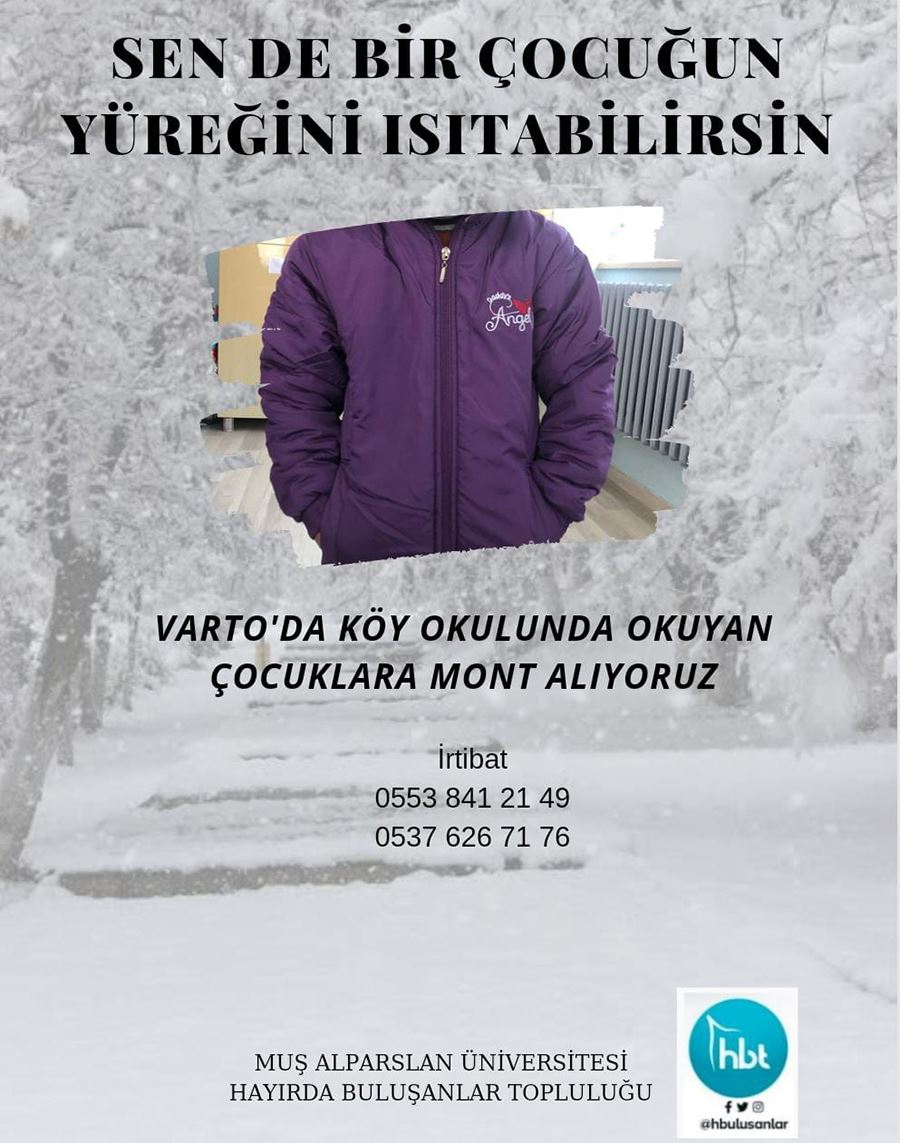Muş Alparslan Üniversitesi (MAUN) de faaliyet gösteren öğrenci topluluklarından Hayırda Buluşanlar Topluluğu (HBT) etkisini arttıran soğuk havada ihtiyaç sahipleri için çocuklar için mont kampanyası başlattı.