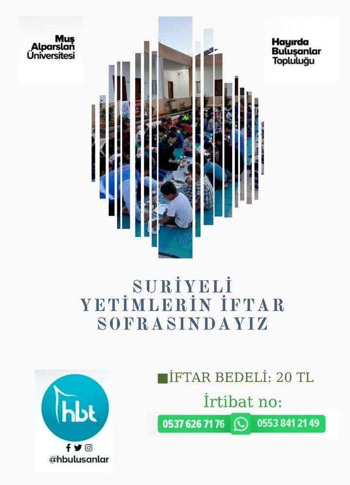 Yapmış oldukları yardımlarla gönüllerde yer edinen Muş Alparslan Üniversitesi Hayırda Buluşanlar öğrenci topluluğu hayırseverlerle ihtiyaç sahipleri arasında köprü olmaya devam ediyor. Gerek kendi imkanlarıyla oluşturdukları gerekse hayırsever vatandaşlar tarafından oluşturulan yardım kolilerini ihtiyaç sahibi vatandaşlara ulaştırma noktasında tüm gayretlerini sarf eden topluluk gönüllüleri yardım kampanyalarına ülke sınırları dışında da devam ettiriyor. Bu kapsamda Ramazan ayı öncesi başlatmış oldukları “Bir Gıda Kolisi İle Kardeş Ailem Olur Musun” yardım kapmanyasından sonra şimdide Suriye’nin İdlip şehrindeki yetimhanelerde kalan onlarca çocuğa iftar vermek için “Suriyeli Yetimlerin İftar Sofrasındayız” adıyla yeni bir kampanya daha başlattılar. Hayırseverlerden destek bekleyen topluluk gönüllüleri yapılacak olan yardımlarla Suriye’deki savaşın gölgesinde yaşayan yetim çocukların gönüllerine de dokunmak istiyorlar. Bu anlamlı kampanyaya destek vermek isteyenler topluluk gönüllüleriyle iletişime geçebilirler.