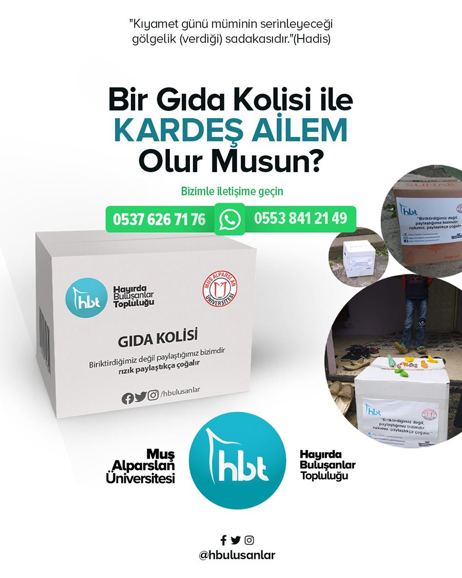 Muş Alparslan Üniversitesi (MŞÜ)’de faaliyet gösteren Hayırda Buluşanlar Topluluğu (HBT) Ramazan ayı öncesi ihtiyaç sahibi aileler için "Kardeş Ailem Olur Musun” kampanyası başlattı.