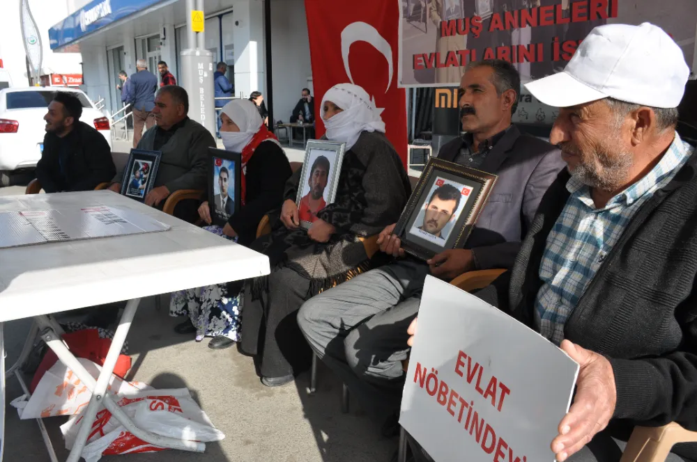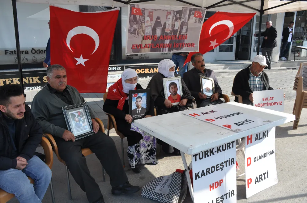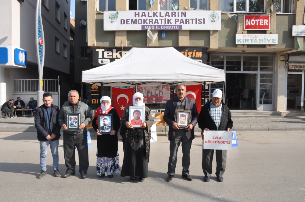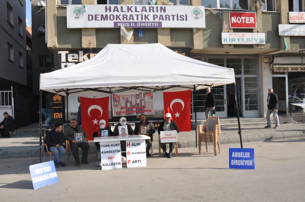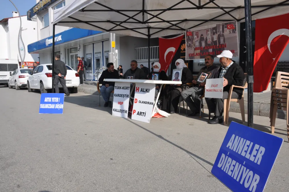 Çocuklarının terör örgütü PKK mensupları tarafından dağa kaçırıldığı iddiasıyla HDP Muş İl Başkanlığı önünde oturma eylemi başlatan aileler, 121 haftadır kararlı bir şekilde devam ettirdikleri evlat nöbetini sürdürüyor.