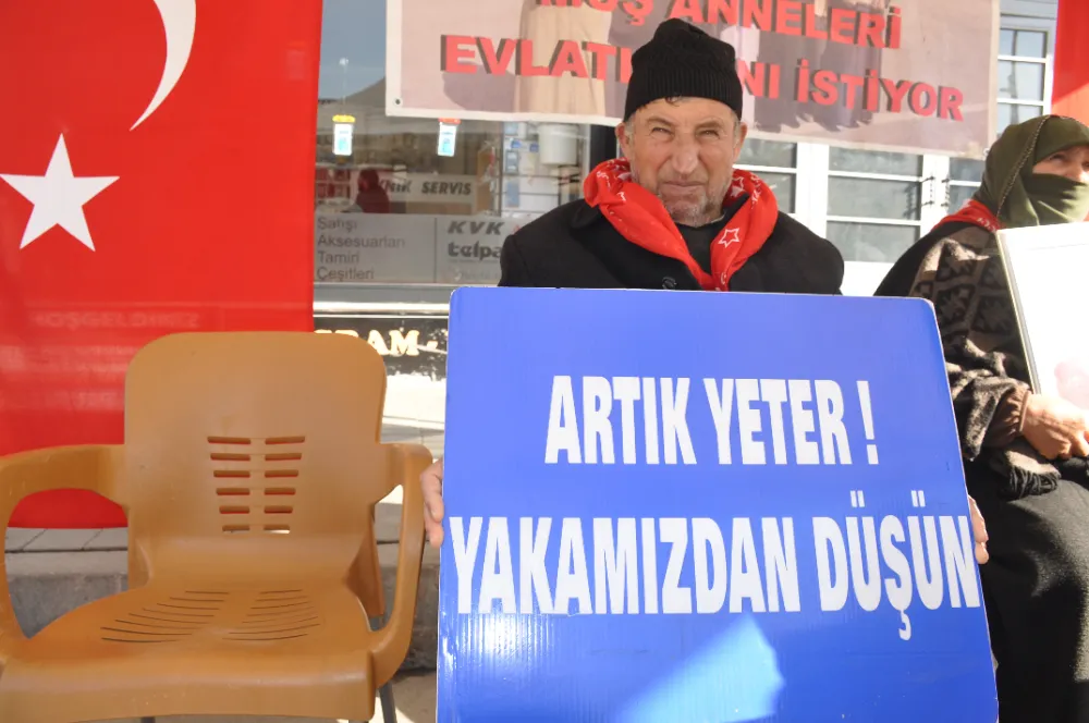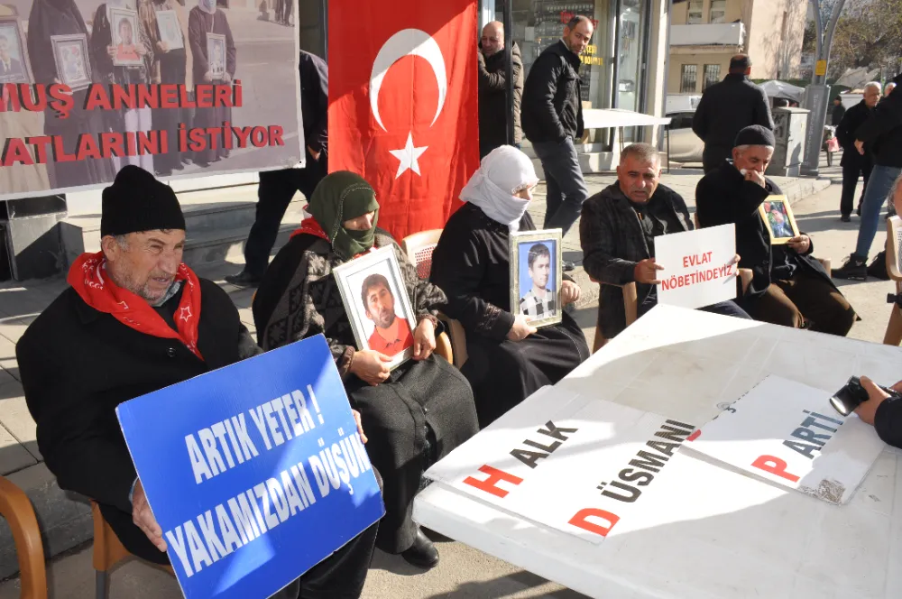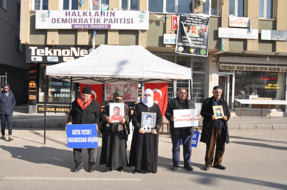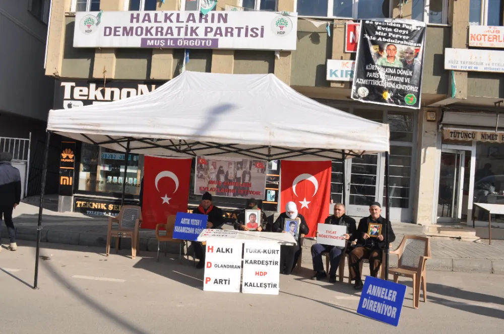 Çocuklarının terör örgütü PKK mensupları tarafından dağa kaçırıldığı iddiasıyla HDP Muş İl Başkanlığı önünde oturma eylemi başlatan aileler, 128 haftadır kararlı bir şekilde devam ettirdikleri evlat nöbetini sürdürüyor.