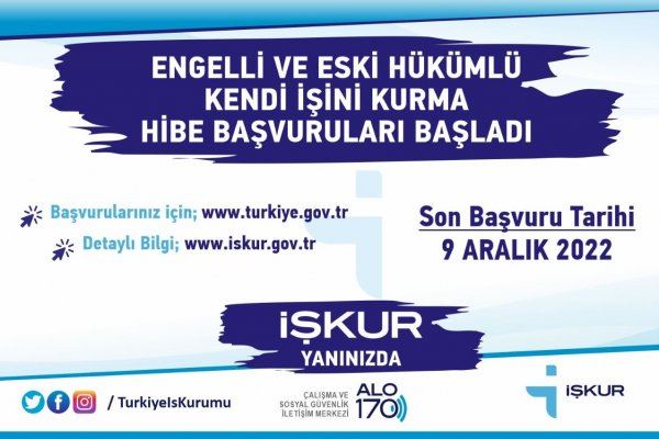 Engelli ve eski hükümlülerin kendi işlerini kurmaları için İŞKUR tarafından başlatılan hibe desteği başvuruları başladı. Destek verilecek olan projelere başvuruda bulunmak isteyenler 9 Aralık 2022 tarihine kadar başvurularını engelliler e-devlet üzerinden eski hükümlüler ise hibe desteği proje başvurularını Adalet Bakanlığının ilgili birimleri (denetimli serbestlik müdürlükleri, koruma kurulları gibi) aracılığı ile İl Müdürlüğüne iletmesi gerekmektedir.