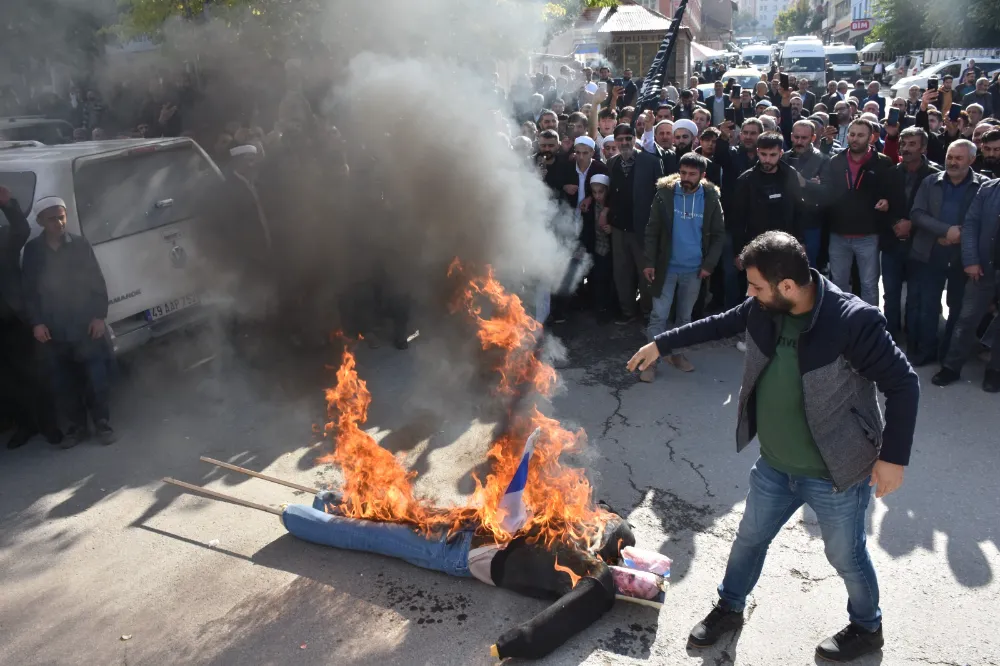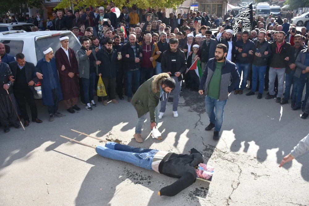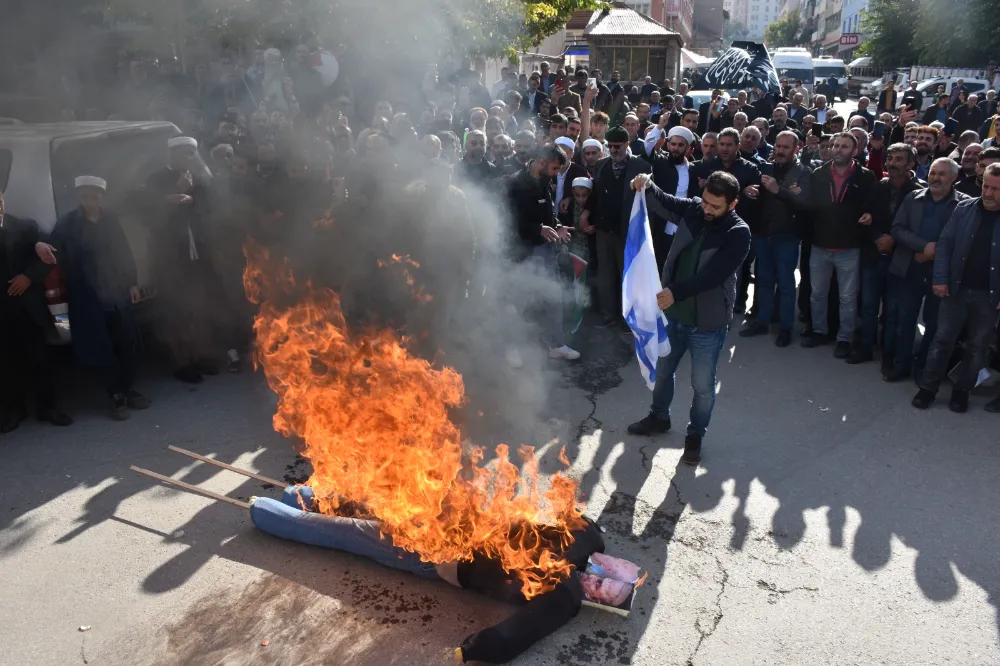 Açıklamanın ardından Filistin’e destek, İsrail’e tepki sloganları atan vatandaşlar Amerika Birleşik Devletleri Başkanı Joe Biden ve İsrail Başbakanı Binyamin Netanyahu’nun maketini benzin dökerek yaktıktan sonra İstasyon Caddesi’nde yürüyüş yaparak eylemi tamamladı.