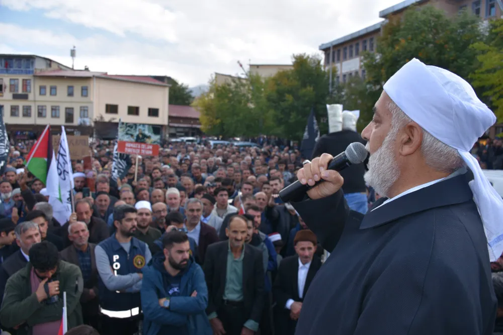 Müslümanların yapması gerekenleri sıralayan Bulu açıklamasında, “Ey kardeşlerim, o halde biz en başta Yahudilerin mallarını boykot edeceğiz. Basın açıklamalarına, mitinglere, yardım kampanyalarına omuz vereceğiz. Çocuklarımıza Filistin’i, Gazze’yi anlatacağız. Ahlakı ve imanı kuşanarak dua edelim. Sosyal medyada, camide, okulda, sokakta kardeşlerimizin yanında olduğumuzu hareketlerimizle, duruşumuzla, davranışımızla, söylemimizle gösterelim. Allah Resulü Bedir’de nasıl ‘şahetil vücuh’ diyerek, müşriklerin yüzüne bir avuç toprak attıysa, bizler de ‘şahetil vücüh’ diyerek bütün beddualarımızı İsrail’in yüzüne atalım. Katil belli, cellat belli, işgalci belli, devlet terörü uygulayan belli, sivil asker ayırt etmeden öldüren belli. Diğer yanda, mağdur belli, mazlum belli, toprakları çalınan belli, bütün yokluklara rağmen direnen belli, çoluk çocuk demeden her gün şehit verenler belli. Ey Türkiye’deki Siyonist İsrail İşbirlikçileri. Allah’ın izniyle sizin de sonunuz geldi. Ota, böceğe, ite, köpeğe, ağaca sahip çıkan mahlûklar, insanlar vahşice katledilirken sus-pus olan sanatçı müsveddeleri, sizin de gerçek yüzünüzü görüyoruz. Ne kadar yüzsüz olduğunuzu da görüyoruz. Bizler de Muş’un meydanından haykırarak, her zaman Filistinli kardeşlerimizin yanında olduğumuzu, dualarımızla, maddi-manevi katkılarımızla, arkalarında duracağımızı, zillet içinde ezilerek yaşamaktansa şanlı bir ölümü tercih ederek şehadete koşan tüm kardeşlerimizi bağrımıza bastığımızı tüm dünyaya ilan ediyoruz. Biliyor ve iman ediyoruz ki, kuvvet ve kudret sahibi tek güç Allah’tır. Zalimler istemese de Allah nurunu tamamlayacaktır” ifadelerini kullandı.