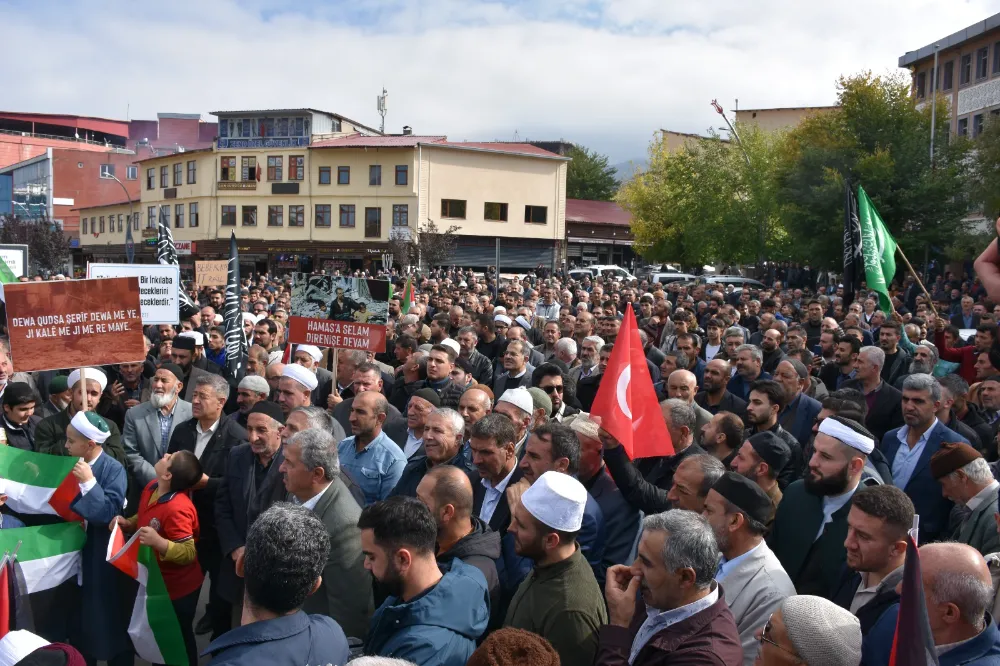 Muş’ta, İsrail’in Filistin’e yönelik saldırılarına tepki göstermek ve Filistin’e destek amacıyla düzenlenen ‘Büyük Mescid-i Aksa Buluşması’ için Belediye Meydanı’nda buluşan kalabalık, İsrail ve Amerika aleyhine slogan attı. İsrail'in saldırılarını öfkeli bir dille protesto eden kalabalık, ellerinde saldırıları kınayan dövizler taşıdı.