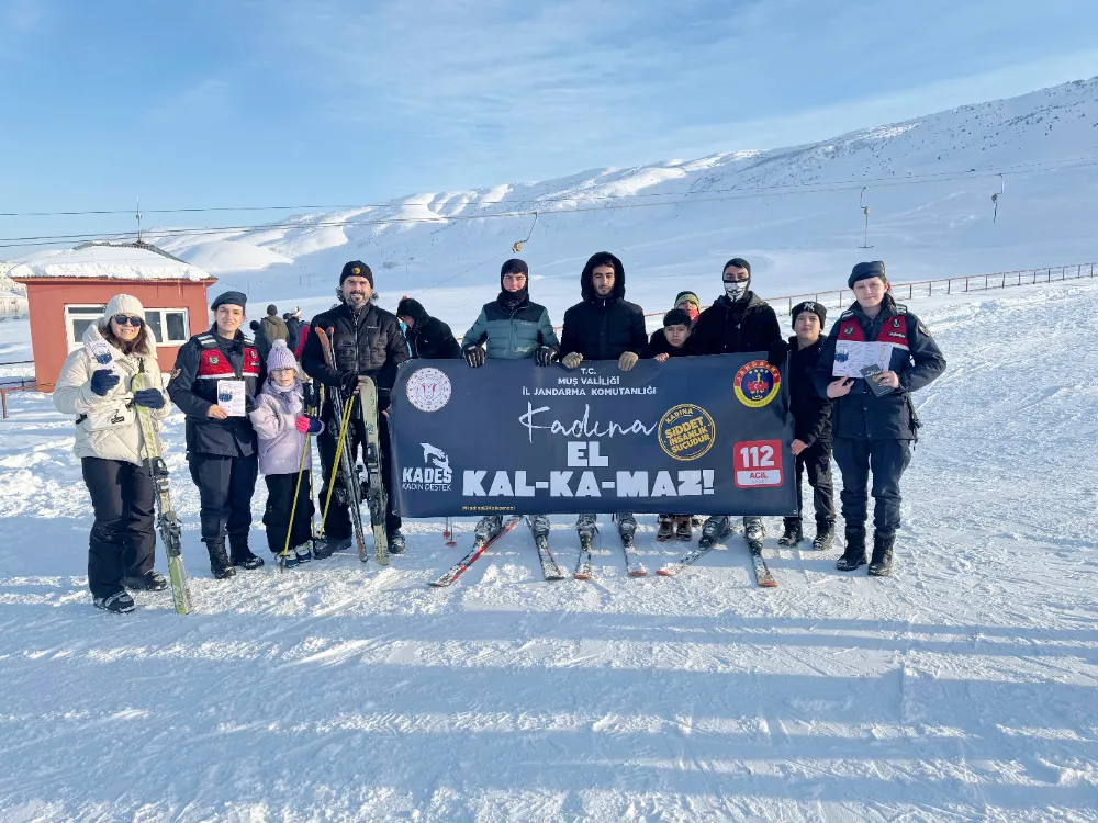 İl Jandarma Komutanlığı, kadına yönelik şiddetle mücadele kapsamında kış şartlarına rağmen sahadaki çalışmalarını sürdürerek Muş Kayak Merkezi’nde vatandaşlarla bir araya geldi. KADES uygulaması, 6284 sayılı Kanun ve erken yaşta evlilikler konusunda bilgilendirme yapan ekipler, “Kadına El KAL-KA-MAZ” mesajıyla toplumsal farkındalığın artırılmasını hedefledi.