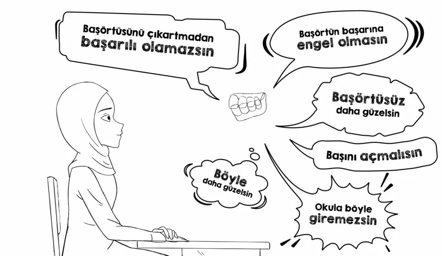 Söz konusu dönem zihniyetinin karikatürize edildiği filmde ayrıca, Nur Serter, Kemal Alemdaroğlu, Kemal Gürüz gibi dönemin gerçek aktörlerine ait seslerle ikna odasındaki genç kıza, "Okula böyle giremezsin.", "Başörtüsüz daha güzelsin.", "Başını açmalısın.", "Başörtün başarına engel.", "Başörtünü çıkartmadan başarılı olamazsın." şeklinde telkinlerde bulunuluyor.