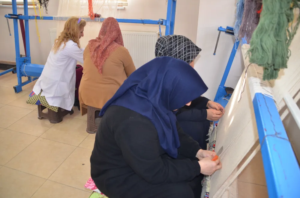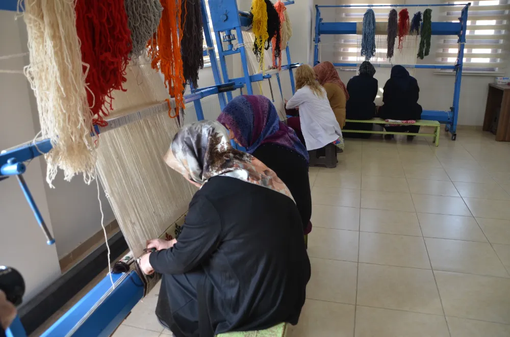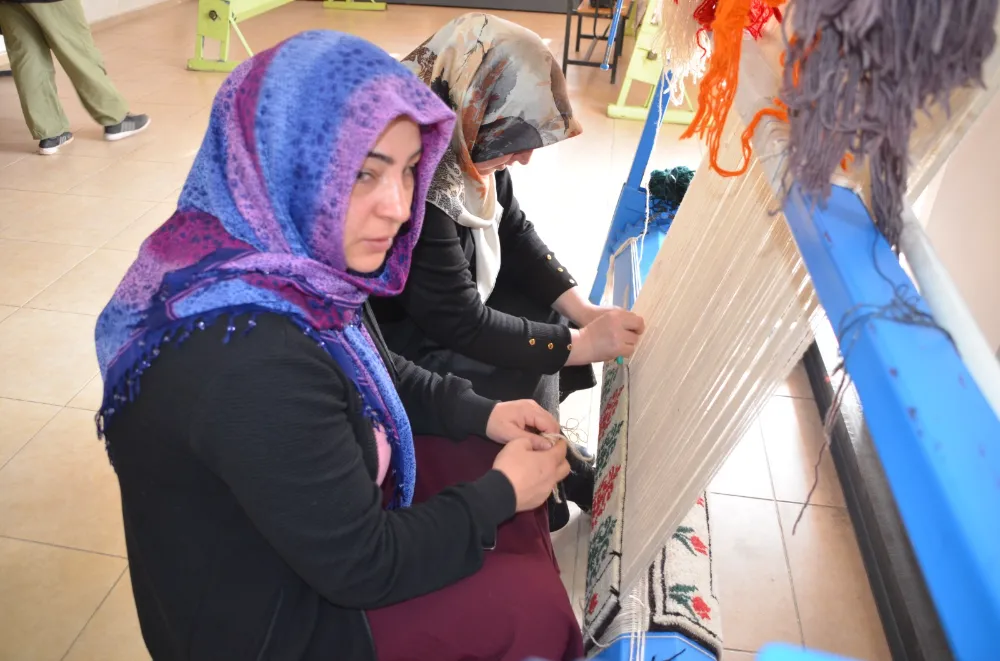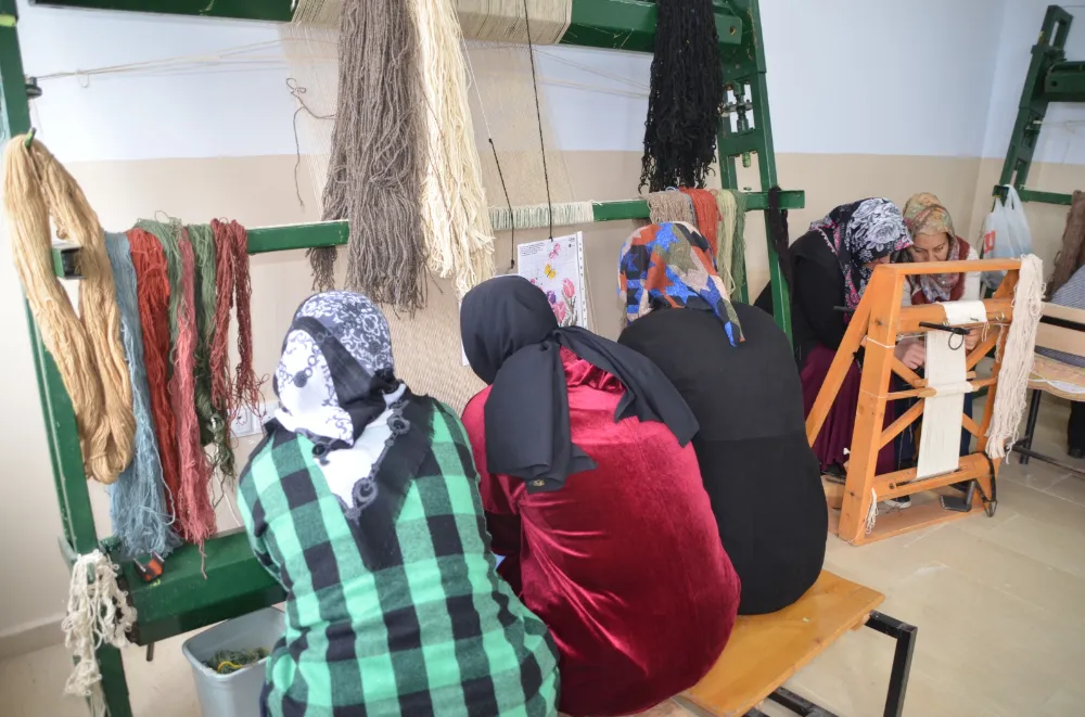 Muş'ta, Halk Eğitimi Merkezi bünyesinde açılan kurslara katılan kadınlar, atölyelerde halı ve kilim dokuyarak hem gelir elde ediyor hem de dokuma kültürünü yaşatıyor.
