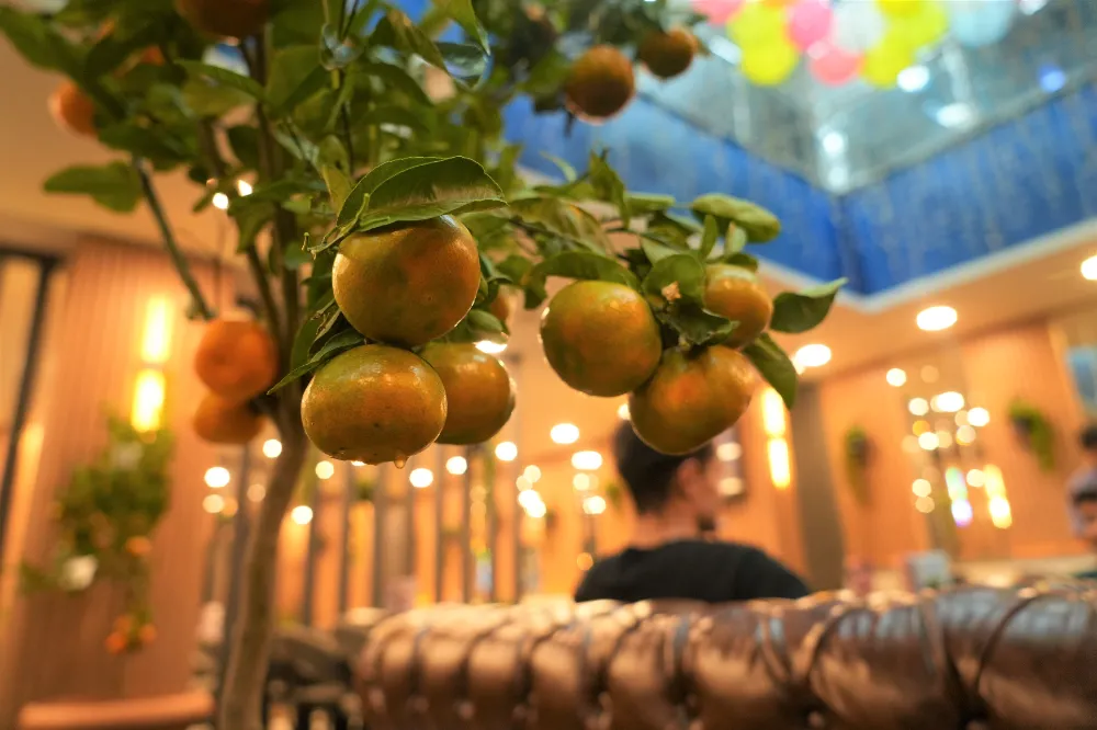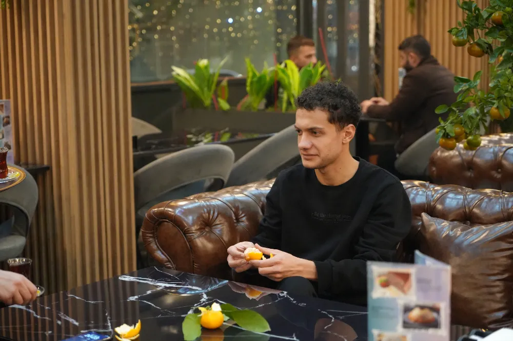 Saksıda yetiştirdiği mandalina ağaçlarıyla kafesine doğal bir atmosfer katan Nezir Yolcu, olgunlaşan meyveleri müşterilere ikram ederek farklı bir deneyim sunuyor.