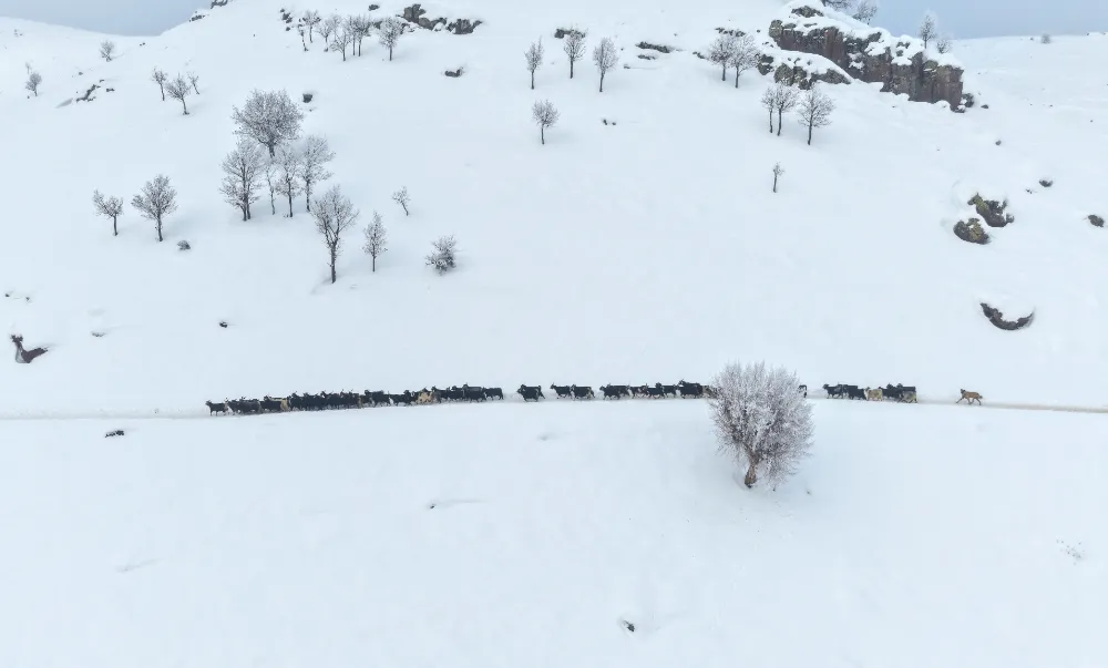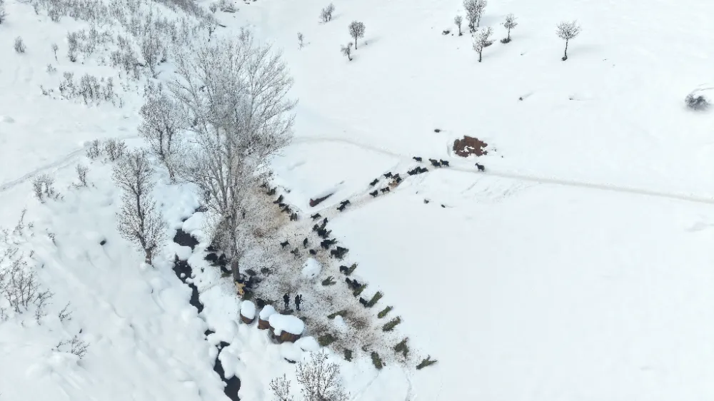 Belirli saatlerde hayvanlarını karla kaplı alanlara çıkaran üreticiler, dondurucu soğuğa rağmen hayvanlarının bakımını aksatmıyor. Kış mevsimiyle birlikte iş yüklerinin iki kat artan besiciler, tüm zorluklara rağmen tek geçim kaynakları olan hayvancılığı sürdürmeye çalışıyor. Besiciler, hayvanlarını sağlıklı bir şekilde bahar aylarına ulaştırabilmek için çetin kış mesaisini aralıksız sürdürüyor.