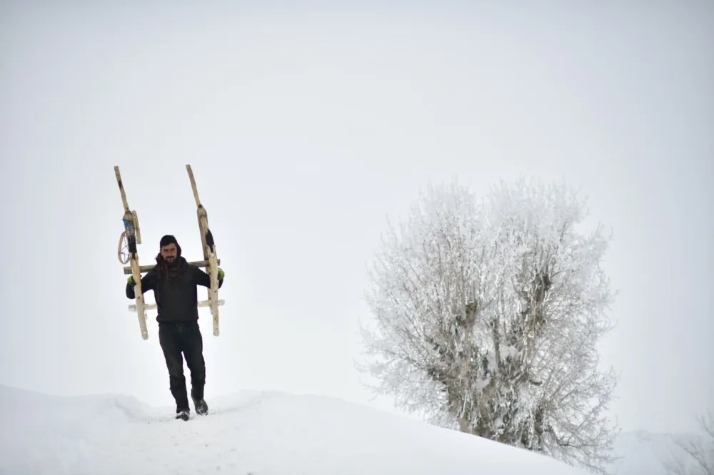 Muş’un yüksek rakımlı köylerindeki besiciler, yazın topladıkları meşe yapraklarını çetin kış şartlarında kızaklarla taşıyarak hayvanlarını beslemeye çalışıyor.