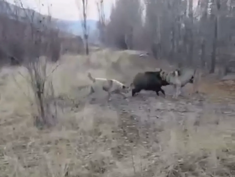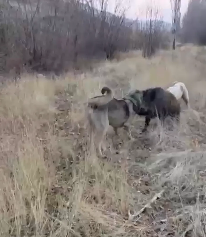 Muş'un Korkut ilçesine bağlı Karakale köyünde tarlaya inen yaban domuzu, çoban köpeklerinin saldırısına uğradı. O anlar cep telefonu kamerasıyla kaydedildi.