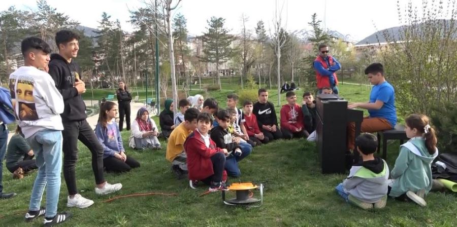 Duyduğu sesleri notaya dökebilme yeteneğine sahip 11 yaşındaki görme engelli Bager Çalışcı, Kahramanmaraş merkezli meydana gelen depremlerde etkilenen çocuklar için Muş Göletli Park’ta moral konseri verdi.