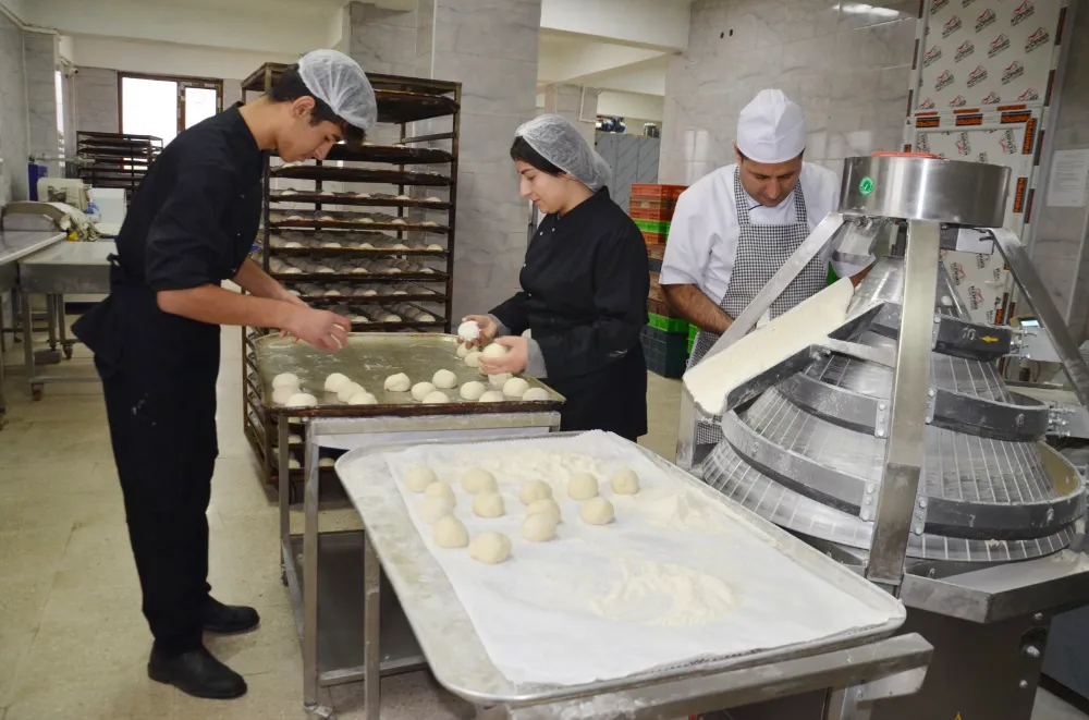 Muş Nusret Sarman Mesleki ve Teknik Anadolu Lisesi öğrencileri, okulda kurulan fırında günlük binlerce ekmek üretirken uygulamalı meslek eğitimi alıyor. Hamurun yoğrulmasından şekil verilmesine kadar her aşamada deneyim kazanan öğrenciler, stajlarla da sektöre hazırlık yapıyor.