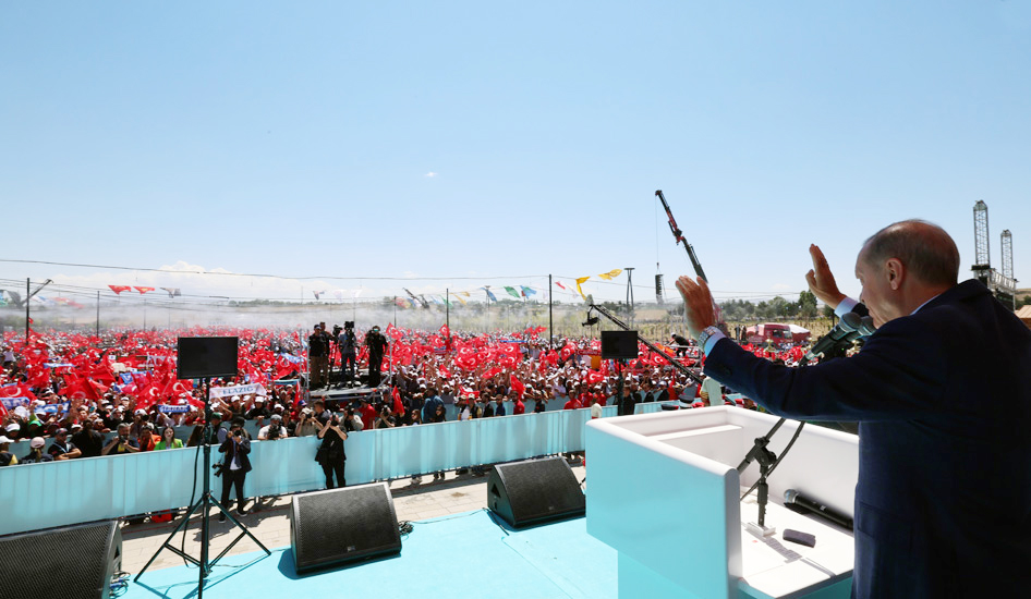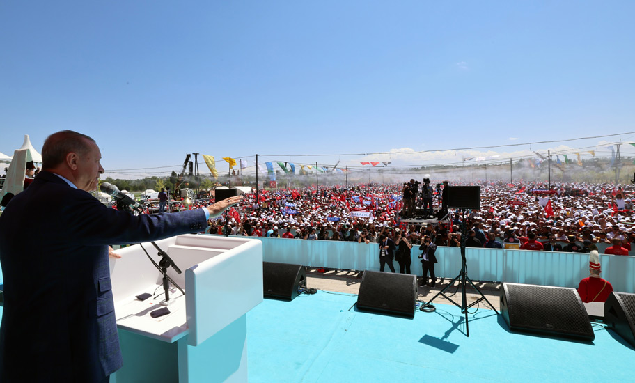 Alandakilere, "31 Mart'a hazır mıyız? Yerel yönetim seçimlerine hazır mıyız? İllerimizi, maalesef bizlere yakışmaz hâle getirenlerin elinden tekrar geri almaya hazır mıyız? Anadolu'daki son devletimiz Cumhuriyetimizin 100. yılına ulaştığımız 2023 yılını yeni bir şahlanış vesilesi hâline getirmekte kararlı mıyız?" diye soran Cumhurbaşkanı Erdoğan, alandan aldığı "Evet" sözleri üzerine şöyle devam etti: "Bu öylesine ifade edilmiş hamaset, rastgele söylenmiş bir söz değildir. Bugün burada gerisinde çok büyük emeklerin ve mücadelelerin olduğu bir vizyondan söz ediyoruz. Sadece son 20 yılda ülkemizin her karış toprağına ulaştırdığımız eser ve hizmetlerimizle Cumhuriyetimizin kazanımlarını tahkim ettik. Artık bu güçlü altyapı üzerinde asıl hedeflerimize yönelmenin vaktidir, diyoruz. Bazı başlangıçlar vardır ki tarihin akışını değiştirir. İşte biz de Cumhuriyetimizin yeni asrına böyle bir başlangıçla girmek istiyoruz. Tarihimize zaferler ayı olarak geçen ağustostan aldığımız ilhamla, gençlerimize devredeceğimiz bu özlemimizi, bu hedefimizi her geçen gün daha yüksek bir sesle haykırıyoruz."