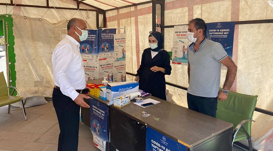 Aşı çadırını ziyaret eden Belediye Başkanı Altın, sağlık çalışanları ile sohbet ederek aşı çalışmaları hakkında bilgi aldı.
