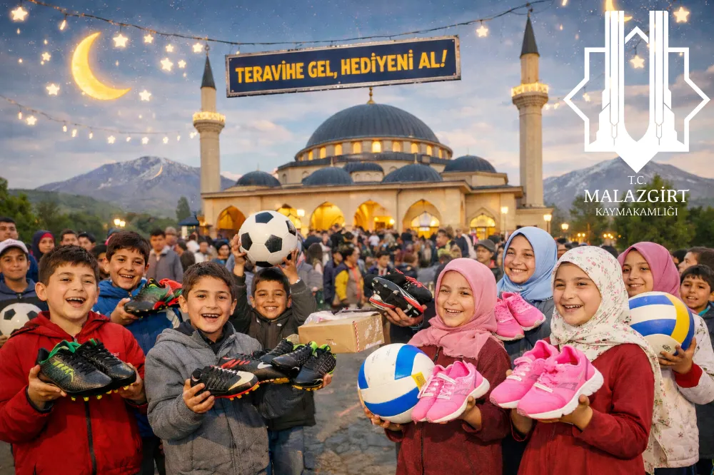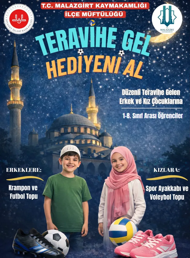 Muş’un Malazgirt İlçe Kaymakamlığı ve İlçe Müftülüğü, Ramazan ayının manevi iklimini çocuklara sevdirmek ve cami kültürünü aşılamak amacıyla dev bir projeye imza attı. "Teravihe Gel, Hediyeni Al" sloganıyla başlatılan kampanya kapsamında, teravih namazlarını aksatmayan 1-8. sınıf arası öğrencilere spor ayakkabısı ve top hediye edilecek.