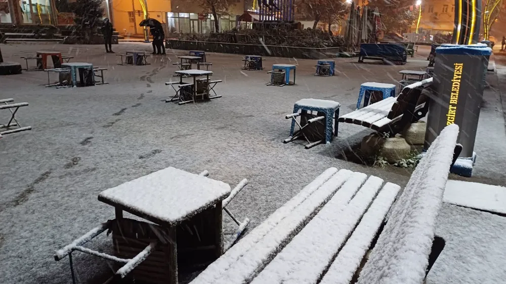 Muş'un Malazgirt ilçesinde etkili olan kar, ilçe merkezini beyaza bürüdü.