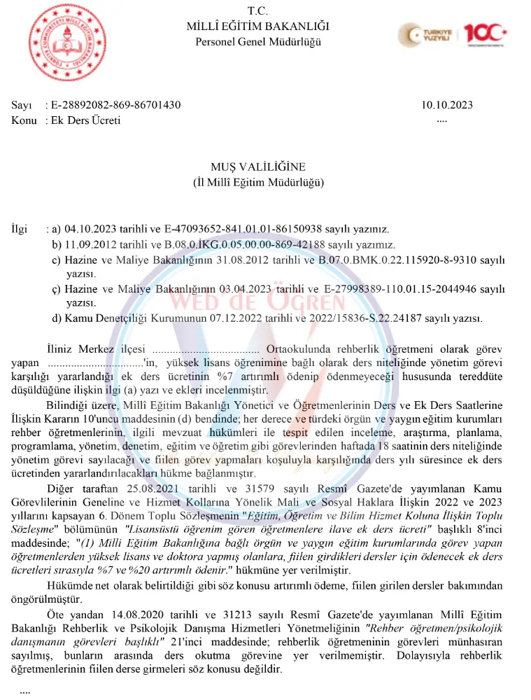 Millî Eğitim Bakanlığı Personel Genel Müdürlüğü, Muş Valiliği İl Millî Eğitim Müdürlüğü'ne bir yazı göndererek, bir rehberlik öğretmeninin yüksek lisans öğrenimine bağlı olarak aldığı ek ders ücretinin yüzde 7 artırılması konusunda bir tereddüt olduğunu belirtildi.