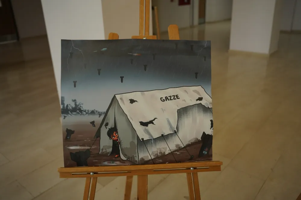 Sergi, Gazze’deki acıyı, yıkımı ve imanın sarsılmaz direnişini yansıtan resim ve fotoğraflarla ziyaretçilere duygusal anlar yaşatıyor.