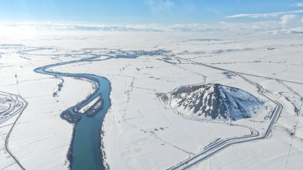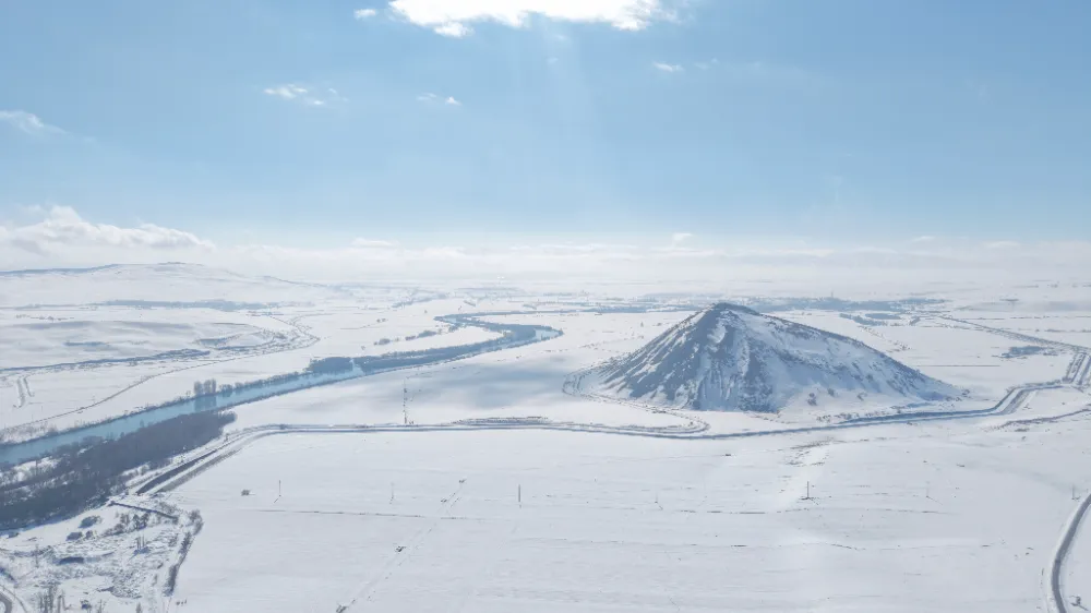 Kar yağışının ardından beyaza bürünen Mercimek Kale Höyüğü, kartpostallık manzaralar sunarken; jeomorfolog Dr. İskender Dölek, doğal ve kültürel değeriyle öne çıkan alanın jeorotalar ve kültür rotaları kapsamında turizme kazandırılması gerektiğini vurguladı.