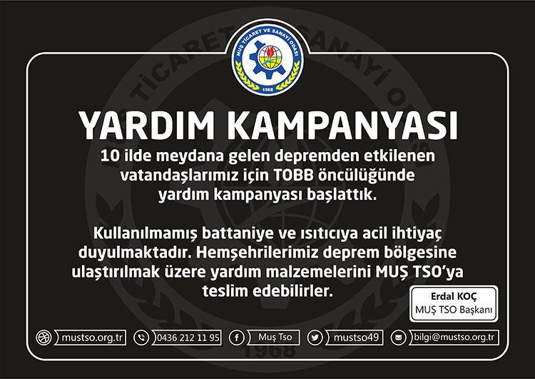 Muş Ticaret ve Sanayi Odası Başkanı Erdal Koç, Türkiye Odalar ve Borsalar Birliği öncülüğünde yardım kampanyası başlattıklarını duyurdu. Deprem bölgesinde en çok ihtiyaç duyulan malzemelerin başında ısıtıcı ve battaniye geldiğini belirten MUŞ TSO Başkanı Erdal Koç, depremzedelerin yaralarını sarmak için herkesin duyarlı davranması gerektiğini ifade etti.
