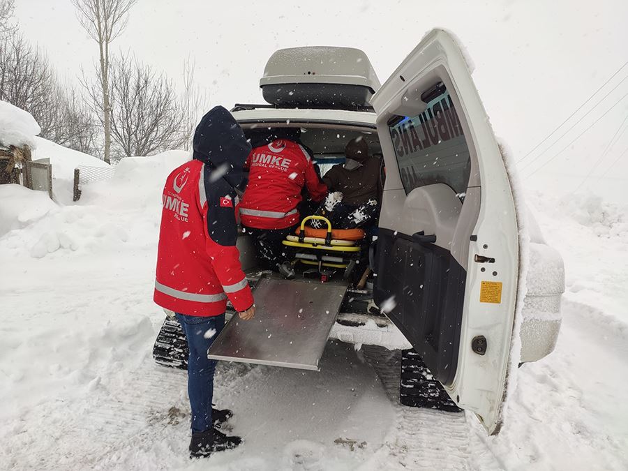 Merkeze 55 kilometre mesafedeki Ulukaya köyü Aydoğdu mezrasında rahatsızlanan astım ve korona virüs pozitif hastası 45 yaşındaki Mehmet Ali Öztürk, 112’den yardım istedi. Bölgeye yönlendirilen UMKE ve sağlık ekipleri, tam donanımlı paletli ambulansla mezraya ulaşmak için seferber oldu. Kar kalınlığının yaklaşık 1,5 metreye ulaştığı bölgede ilerlemekte güçlük yaşayan sağlık ekipleri, kara saplanan ambulansın etrafını küreklerle açarak yoluna devam edebildi. Zorlu coğrafyadaki çetin kış şartlarına rağmen mezraya ulaşan sağlık çalışanları, 9 saatlik zorlu çalışmayla Mehmet Ali Öztürk’ün ilk müdahalesini evinde yaptı. Ambulansa alınarak Muş Devlet Hastanesi'ne sevk edilen Öztürk’ün durumunun iyi olduğu ve tedavisine hastanede devam edildiği öğrenildi.