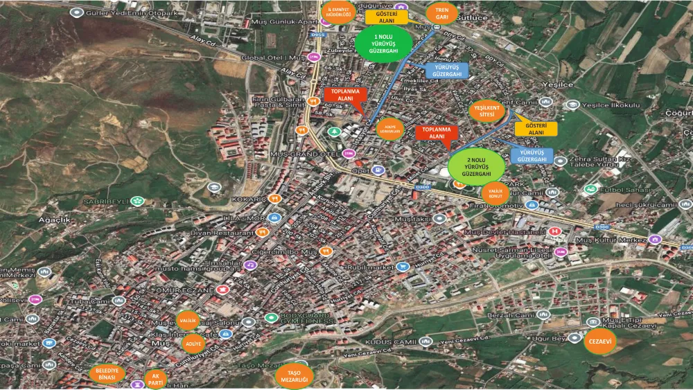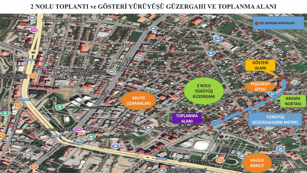 Buna göre, Muş il merkezi polis sorumluluk bölgesinde iki farklı toplantı (miting) alanı ve yürüyüş güzergâhı tespit edildi.