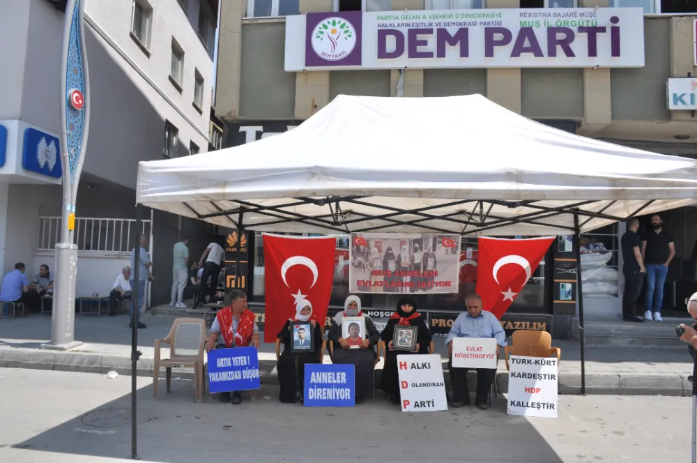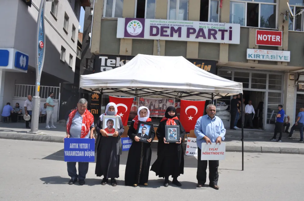Çocuklarının terör örgütü PKK mensupları tarafından dağa kaçırıldığı iddiasıyla DEM Parti Muş İl Başkanlığı önünde oturma eylemi başlatan aileler, 155 haftadır kararlı bir şekilde devam ettirdikleri evlat nöbetini sürdürüyor.