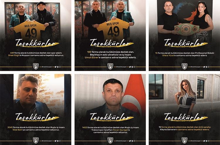 Beşiktaş eski yöneticisi spor adamı Sinan Engin Muşspor forma kampanyasına 449 adet forma alarak ciddi bir destek sağladı. Engin’in dışında yine Beşiktaş eski yöneticilerinden Umut Güner’de almış olduğu 100 adet forma desteğini gösterdi. Ayrıca Profesyonel Boksör Dilara Yücel, ünlü sanatçı Aleyna Dalveren ve Muşlu iş insanları almış oldukları çok sayıda forma ile Muşspor’a desteklerini gösterdiler.