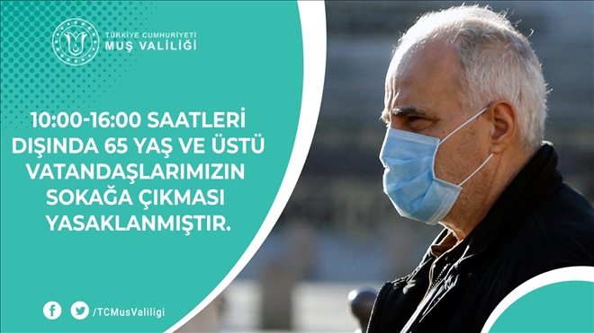 Muş Valiliğinden yapılan açıklamada, Umumi Hıfzısıhha Meclisi´nde 65 yaş ve üzeri vatandaşların 10.00-16.00 saatleri arasında sokağa çıkabilmelerine, bu saatler dışında sokağa çıkma kısıtlaması getirilmesine karar verildiği belirtildi. Alınan karara uymayanlara, Umumi Hıfzısıhha Kanunu´nun ilgili maddeleri gereğince idari işlem yapılacağı belirtilen açıklamada, suç teşkil eden davranışlara ilişkin TCK´nın 195. maddesi kapsamında gerekli adli işlemlerin başlatılmasına karar verildiği aktarıldı