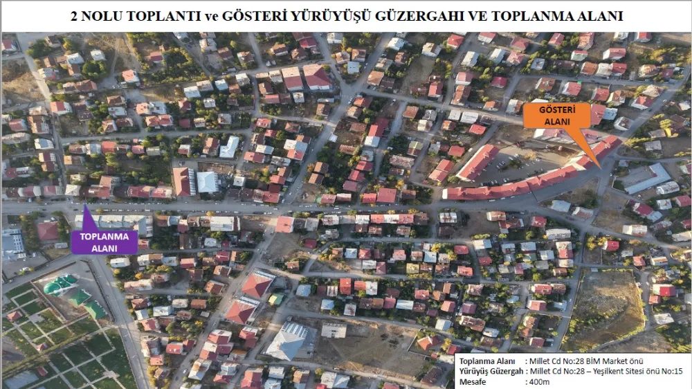 2 no’lu toplantı ve gösteri yürüyüşü güzergâhında ise toplanma noktası Millet Caddesi No:28 adresinde bulunan BİM Market önü olarak açıklandı. Yürüyüş, Millet Caddesi üzerinden ilerleyerek Yeşilkent Sitesi önüyle sınırlı yaklaşık 400 metrelik alanı kapsayacak. Bu güzergâhta düzenlenecek toplantı ve mitinglerin Yeşilkent Sitesi önünde gerçekleştirileceği, dağılımın da belirlenen esaslara göre sağlanacağı ifade edildi.