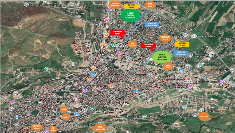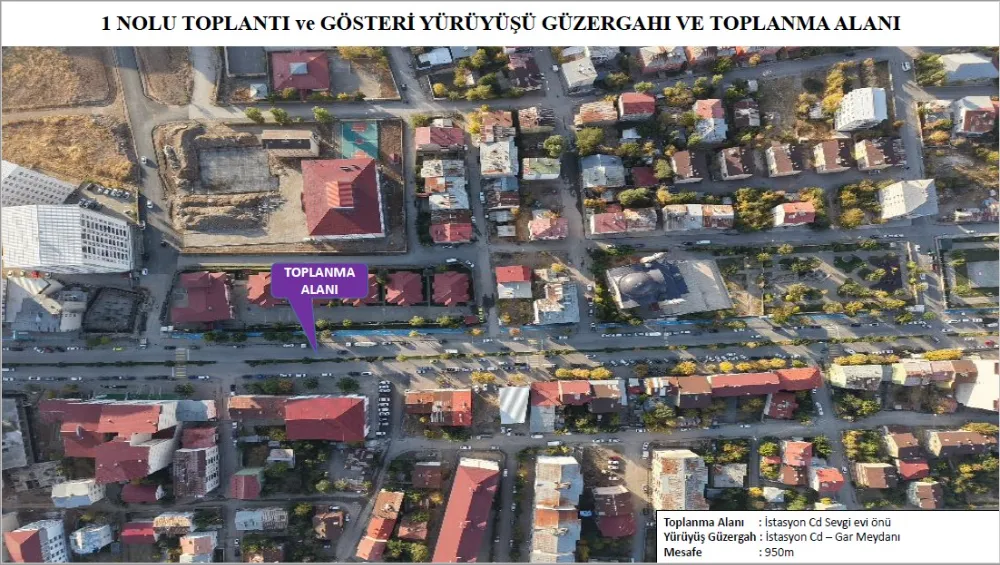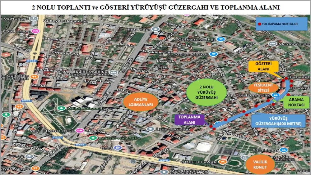 Açıklanan planlamaya göre 1 no’lu toplantı ve gösteri yürüyüşü güzergâhında toplanma yeri, Zafer Mahallesi İstasyon Caddesi üzerinde bulunan Sevgi Evleri önü olarak belirlendi. Katılımcılar, İstasyon Caddesi boyunca ilerleyerek yaklaşık 950 metrelik yürüyüşün ardından Muş Tren Garı önünde bulunan toplantı alanına ulaşacak. Toplantının ardından dağılımın ise valilik tarafından belirlenen plan ve güzergâhlara uygun şekilde yapılacağı bildirildi.