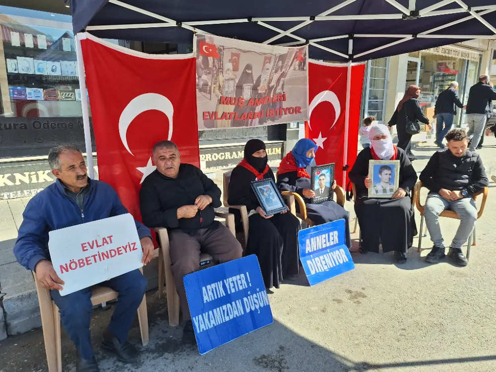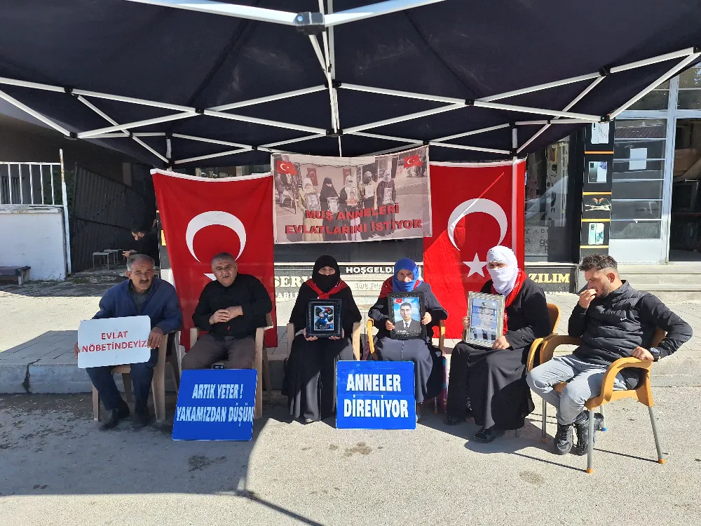 Muş'ta çocukları terör örgütü PKK tarafından kaçırılan aileler, DEM Parti İl Başkanlığı binası önündeki eylemlerine devam ediyor.
