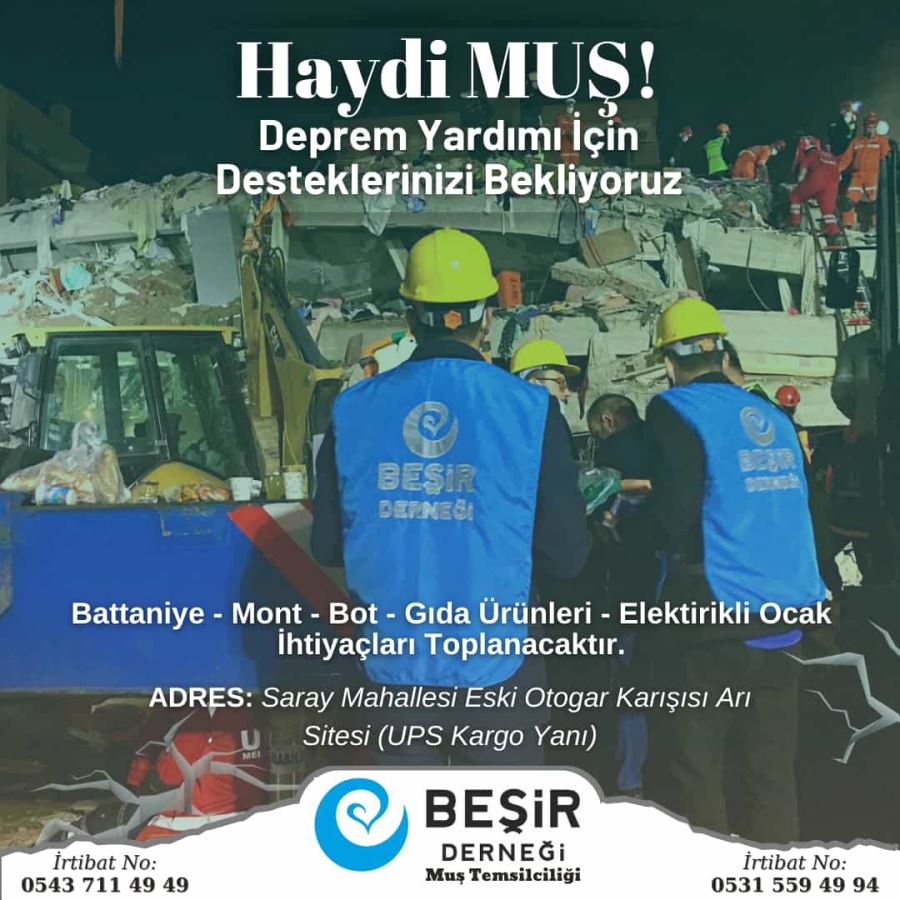 Bu kapsamda Muş Beşir Derneği tarafından da başlatılan yardım kampanyasında depremzedeler için battaniye, mont, bot, gıda, ısıtıcı, çocuk bezi, mama, çocuk kıyafeti yardım kampanyası başlatıldı.
