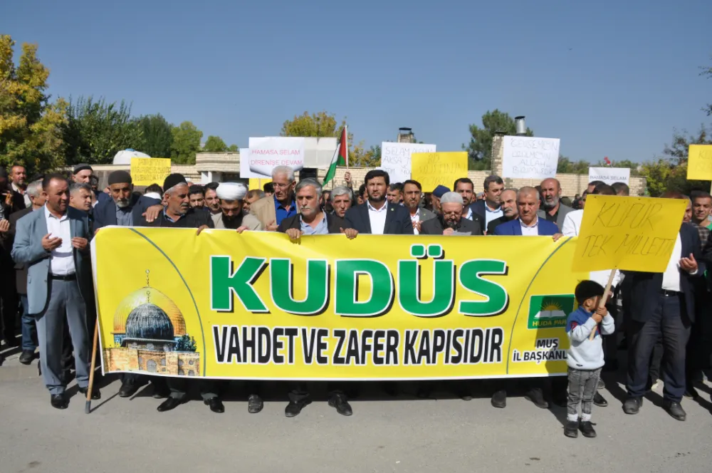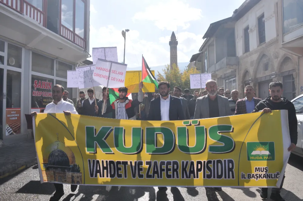 Hacı Şeref Camii önünde toplanan kalabalık Belediye Meydanı’na kadar yürüdü. Burada toplananlar, ellerinde 'Katil İsrail, Filistin'den defol', ‘Hamasa Selam Direnişe Devam’, ‘Muş’tan Hamasa Selam Direnişe Devam’ ‘Kudüs Vahdet ve Zafer Kapısıdır’ yazılı pankart taşıyıp, ABD ve İsrail aleyhine slogan attı. Kalabalık adına açıklamayı yapan HÜDA-PAR Muş İl Başkanı Mehmet Şirin Çağlayan, Gazze’de yıkım, ölüm, vahşet ve katliam olduğunu söyledi. Gazze’nin üstüne bombaların yağdığını ifade eden Başkan Mehmet Şirin Çağlayan, “Gazze’de elektrik yok, su yok, yiyecek yok, yaşama hakkı yok. Gazze’de sadece vahşi bir soykırım var. Masum çocuklar ölüyor, kadınlar ölüyor, ihtiyarlar ölüyor ve bunların toplamı olan siviller ölüyor. Hastanelerde yer yok, yoğun bakımlar işlevsiz, jeneratörlerin yakıtı bitti. Bugün Gazze’de insanlık tarihinde görülmemiş bir vahşet yaşanmaktadır. Emperyalist güçlerin desteğini arkasına alan Siyonist işgal rejimi, bütün dünyanın gözü önünde Gazze’de soykırım uyguluyor. Ama İslam alemi sessiz, dünya sessiz, sözde insan hakları savunucuları başını kuma gömmüş durumdadır” dedi.