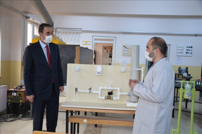 Muş Milli Eğitim Müdürü Enver Kıvanç, öğrenci ve öğretmenler tarafından geliştirilen sistemi yerinde inceleyerek geliştirilen sistem hakkında Tesisat bölümü Atölye Şefi Ömer Örün´nden bilgi aldı.